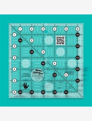 A 45 degree angle is printed in black and is used to trim half-square triangles to size. White horizontal and vertical lines are printed on the square so the center of the ruler is easily distinguishable. Use these lines to square up blocks based on four-patches or embroidered and appliqued blocks.