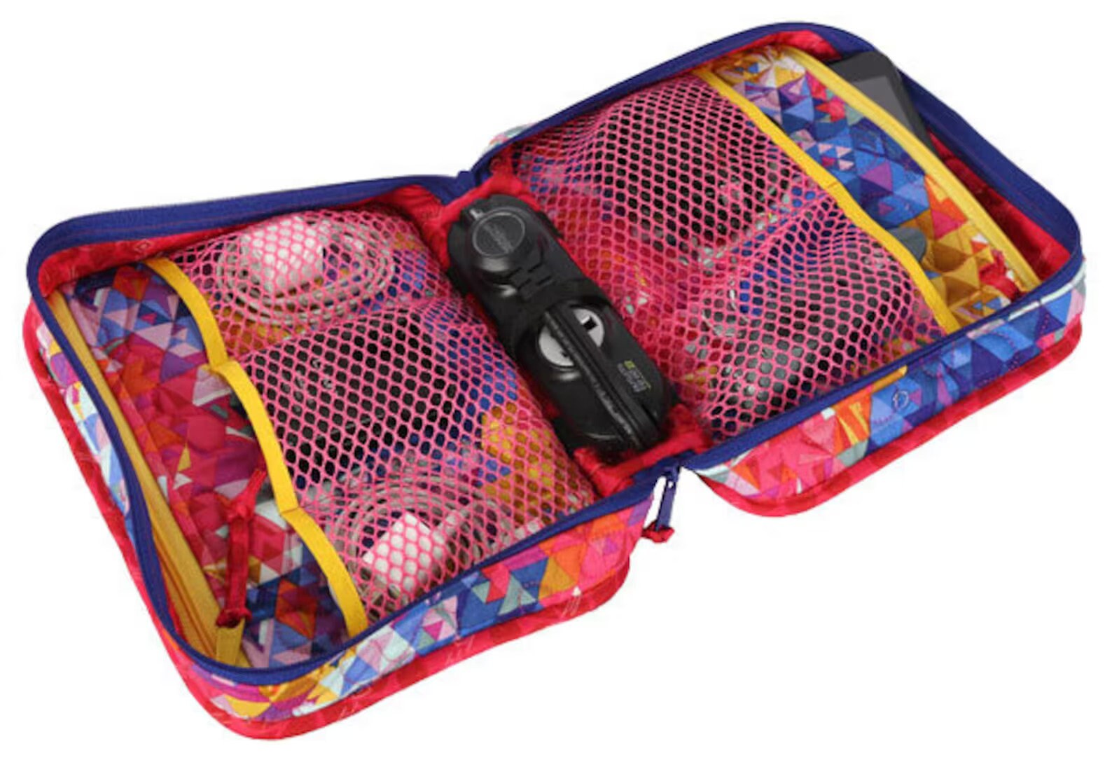 Elastic attachment loops and plenty of pockets keep everything in easy reach. Gusseted mesh pockets provide good visibility and access. Two padded zippered pockets on the inside are perfect for an iPad mini or electronic reader.
