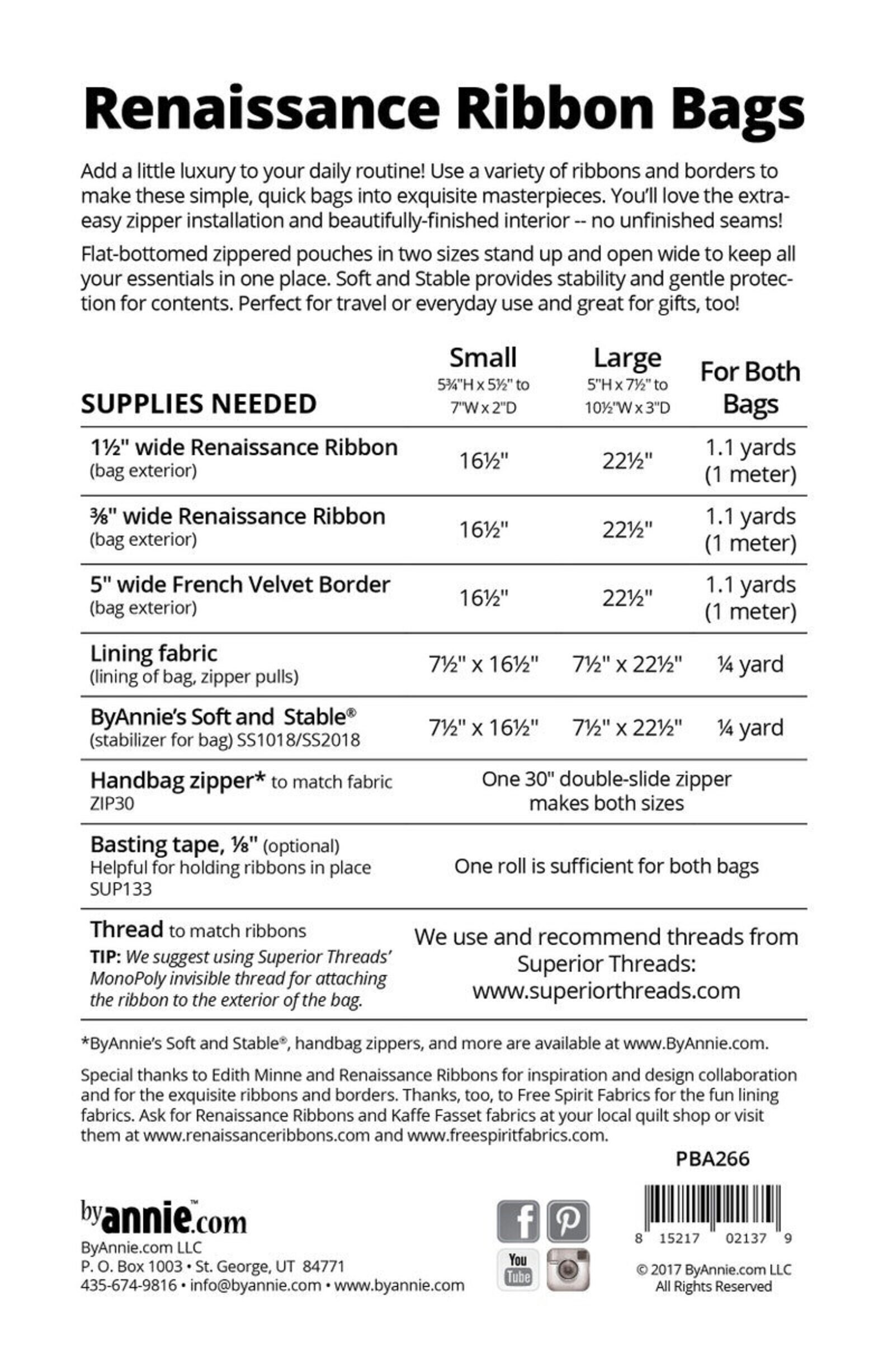 Add a little luxury to your daily routine! Use a variety of ribbons and borders to make these simple, quick bags into exquisite masterpieces. Renaissance Ribbon Bags are perfect for travel or everyday use and great for gifts, too!