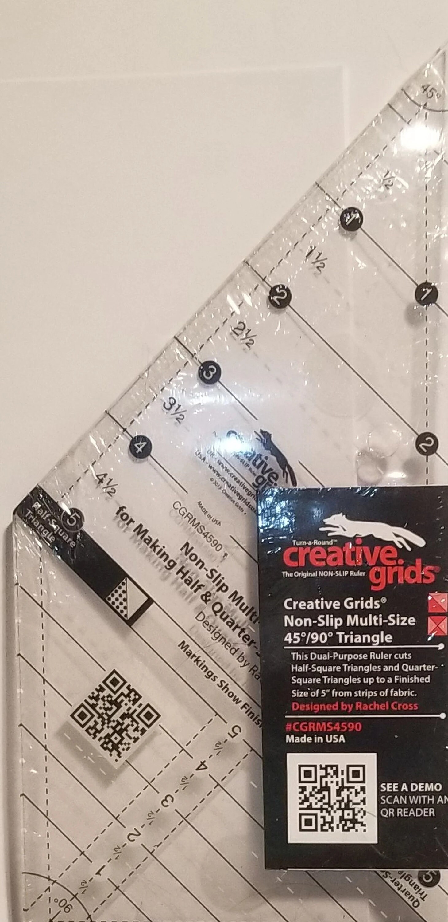This multi-sized ruler features two triangles in one. Use the 45 degree side to cut half-square triangles from strips up to 5-1/2 inches wide, creating half-square triangles up to a finished size of 5 inches. Use the 90 degree side to cut quarter triangles that finish up to a 5 inch finished quarter-square triangle. The math required to cut these angles is incorporated into the easy to read black and white markings.