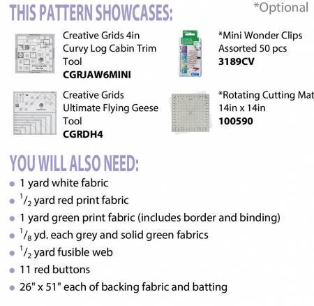 Create the illusion of curves with this 6 inch version of our popular Curvy Log Cabin Trim Tool. Mark the wrong side of the center square through the holes on the ruler to ensure a perfect seam allowance. Then sew a round – two narrow strips and two wide strips and trim. Add two more rounds to complete a perfect 6 inch finished block. Sew four blocks together to “piece” a circle which finishes to 12 inches. Combine these blocks with traditional 6 or 12 inch log cabin blocks created with the Creative Grids Log Cabin Trim Tool Two (CGRJAW2) or the six inch Log Cabin Trim Tool (Item CGRJAW6MN) for unlimited design potential.