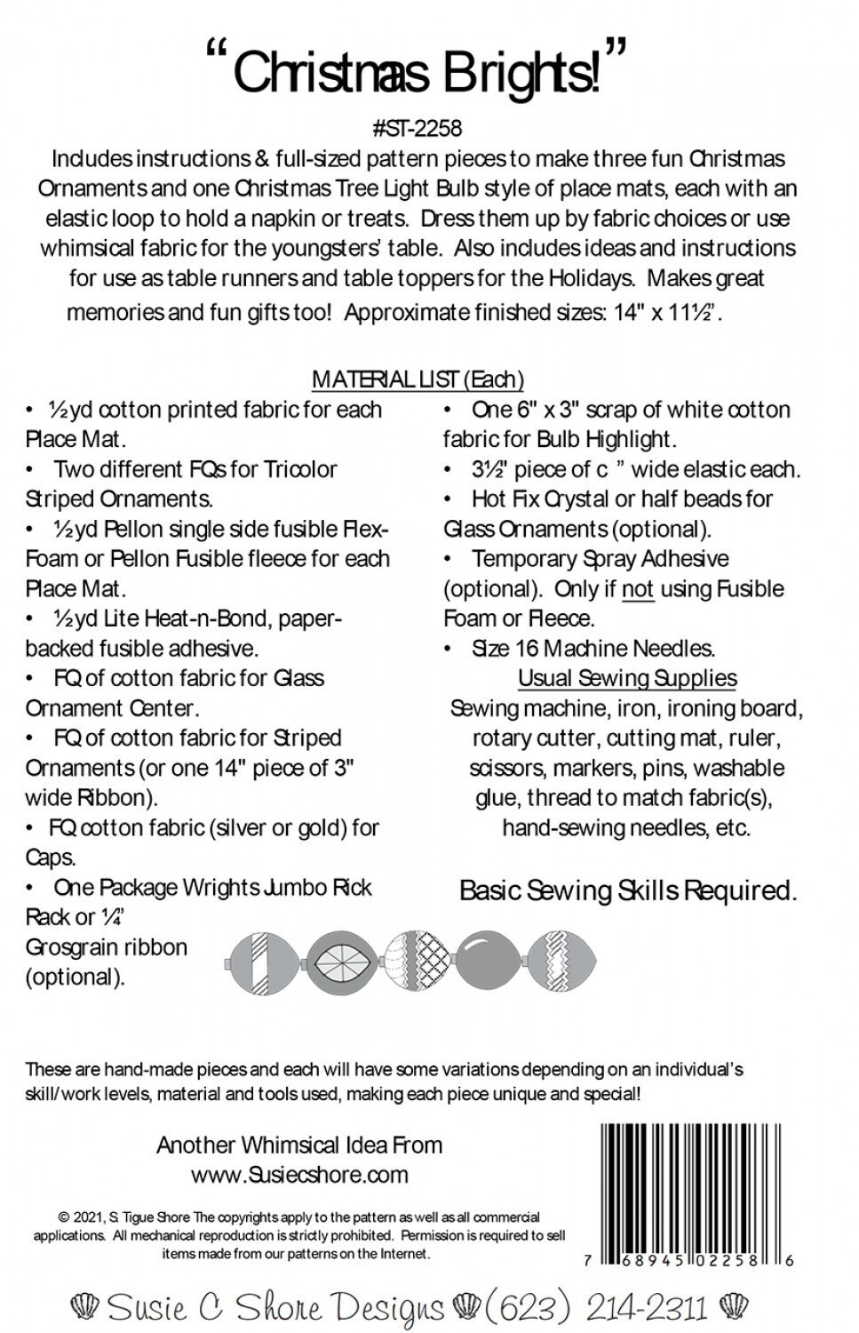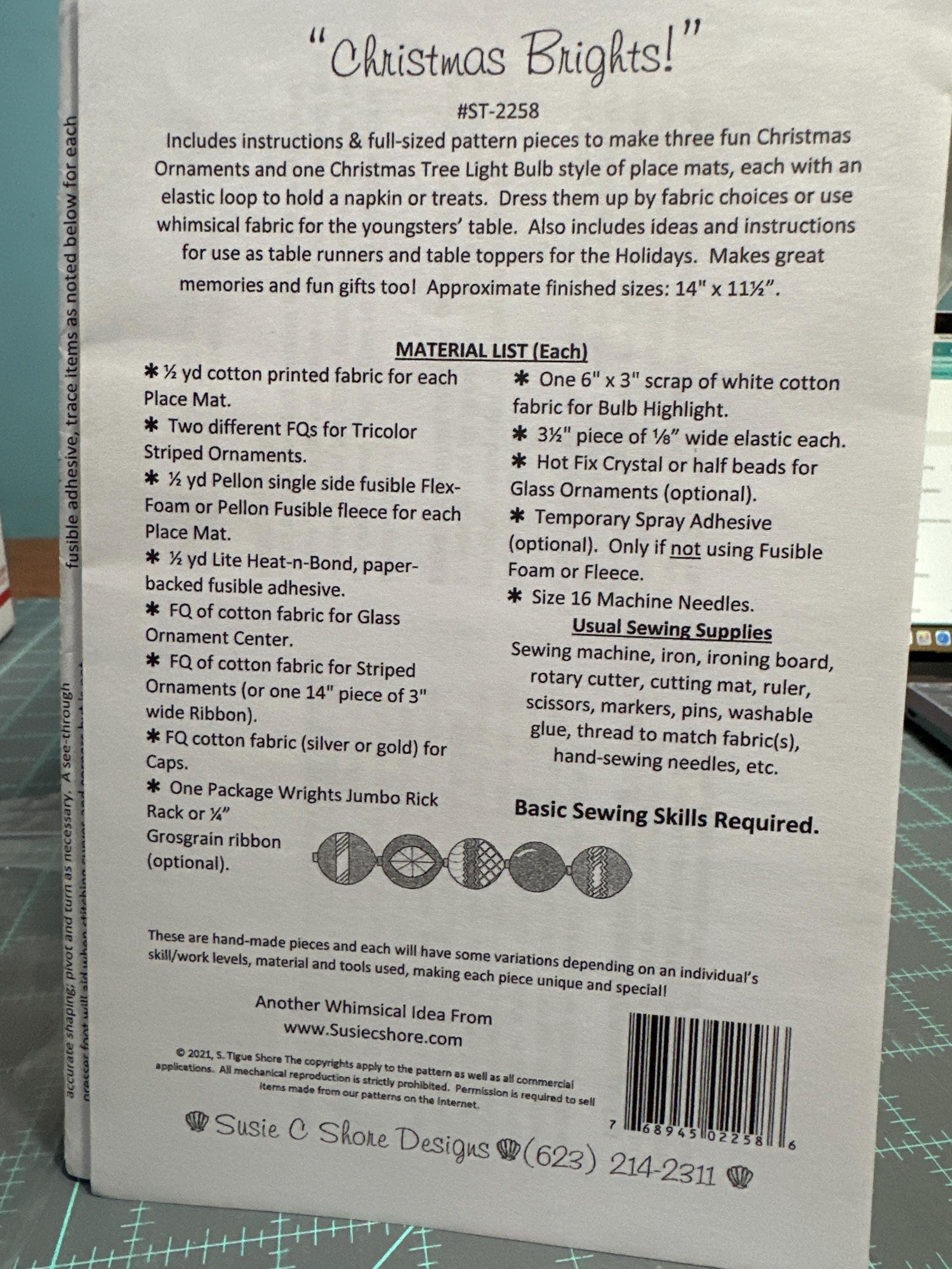 Includes instructions & full-sized pattern pieces to make three fun Christmas Ornaments and one Christmas Tree Light Bulb style of place mats, each with an elastic loop to hold a napkin or treats. Dress them up by fabric choices or use whimsical fabric for the youngsters’ table. Also includes ideas and instructions for use as table runners and table toppers for the Holidays. Makes great memories and fun gifts too! Approximate finished sizes: 14" x 11½”.