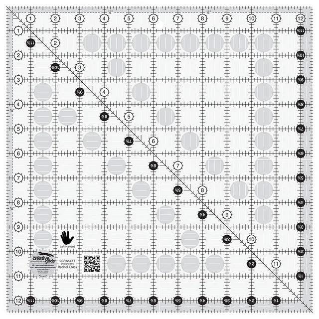 This left-handed version of the 12-1/2in square ruler from Creative Grids® is a mirror image of the original. Now those that cut left-handed can read the markings and numbers right side up. Perfect for trimming one of the most popular sized blocks used in many quilting patterns.