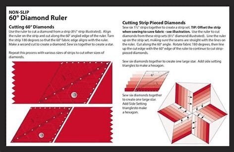 Meet the Mini 60 Degree Diamond Ruler! It has all of the great features of the 60 degree Diamond Ruler (CGR60DIA) but in a smaller, easier to manipulate size for smaller projects! The mini cuts 60 degree diamonds; hexies; and triangles up to 4-1/2 inches. Maximize the design potential by cutting them from strip sets. It comes with fully illustrated step by step instructions or scan the QR Code printed on the instructions to view a video demonstration. The ruler slides easily over the holds the fabric in place while cutting, eliminating slipping and miss-cuts!