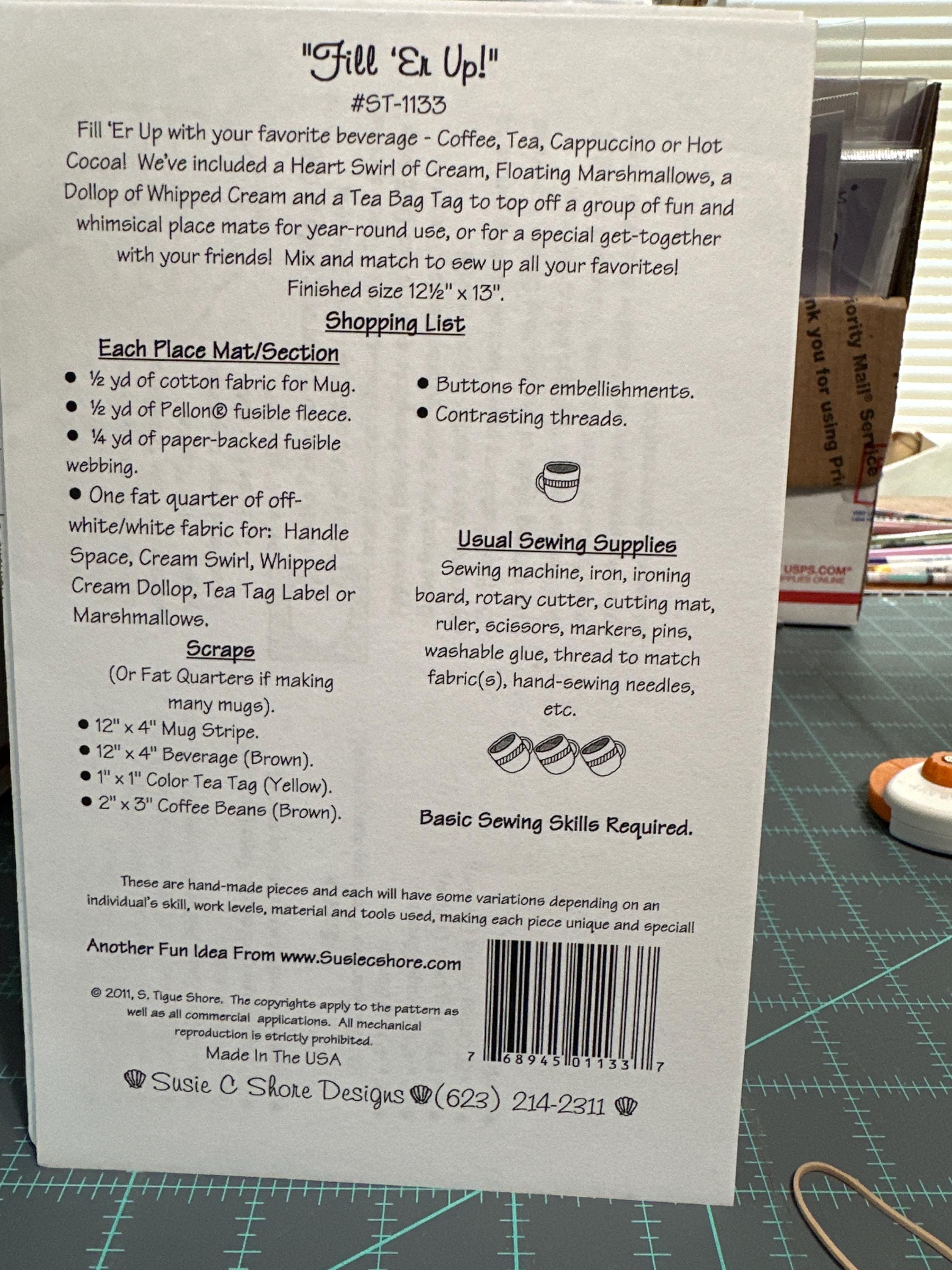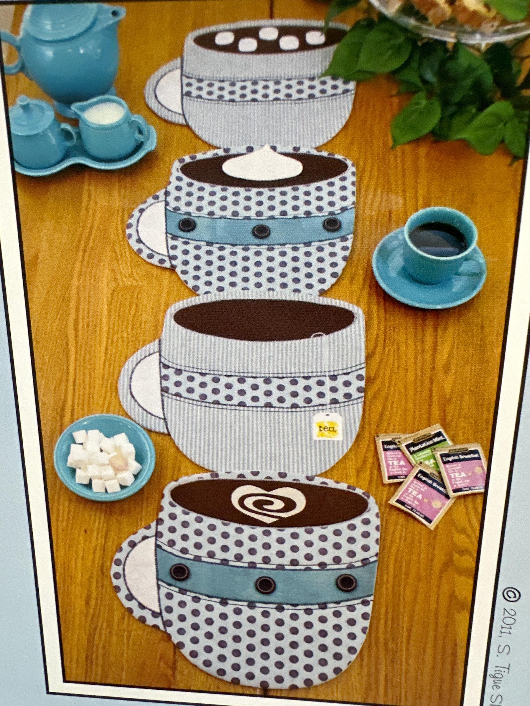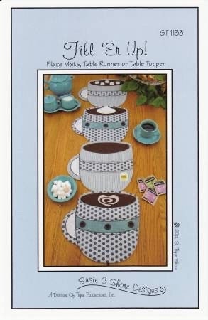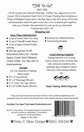 Fill Er Up with your favorite beverage - coffee, tea, cappuccino or hot cocoa! We've included a heart swirl of cream, floating marshmallows, a dollop of whipped cream and a tea bag tag to top off a group of fun and whimsical place mats for year-round use. Finished size 12-1/2in x 13in
