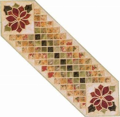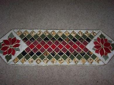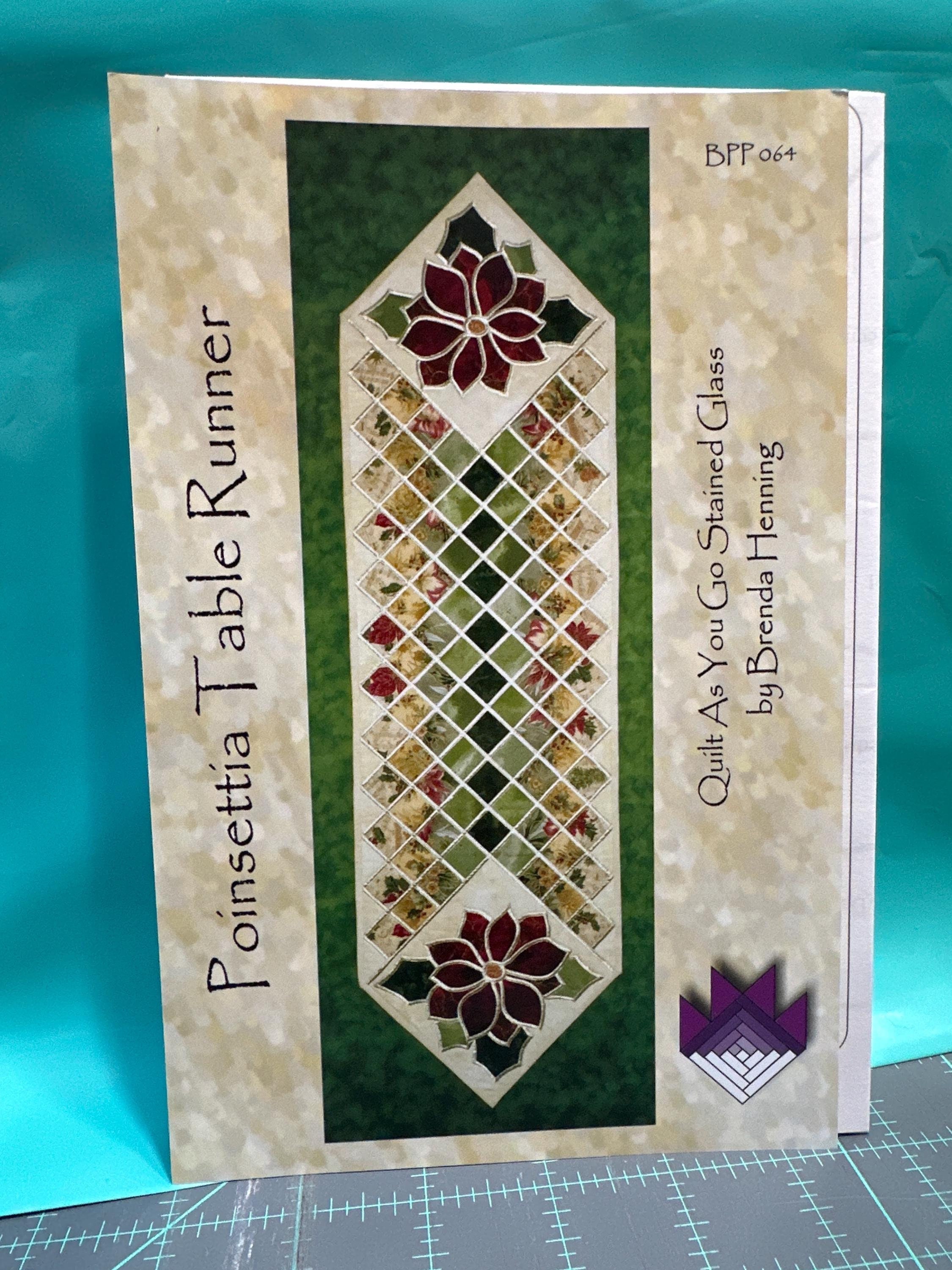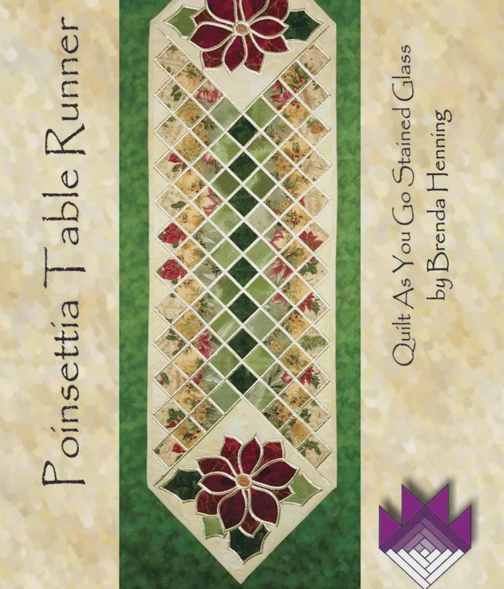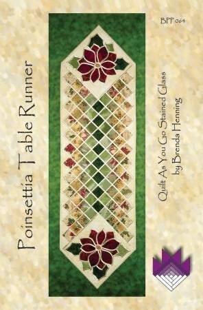 Poinsettia Table Runner - Quilt as You Go Stained Glass. This sparkling elegant Christmas -themed design will add elegance to your holiday table. Easy large-scale stained-glass applique, fully illustrated with step-by-step photos. This is a fairly fast project and is well-suited as a beginner-stained glass workshop. This project requires a 2 - 11-yard reel of fusible bias tape.
