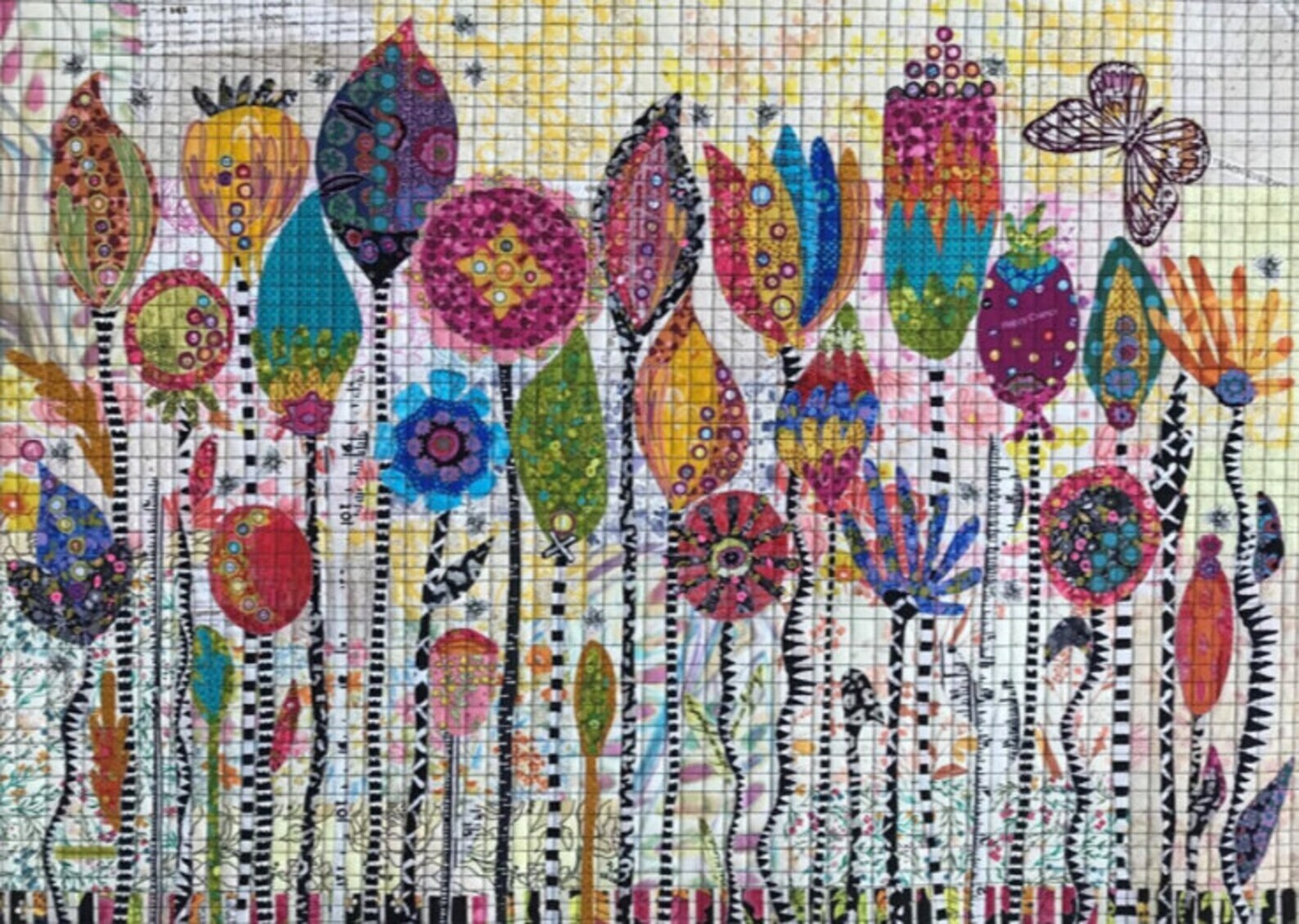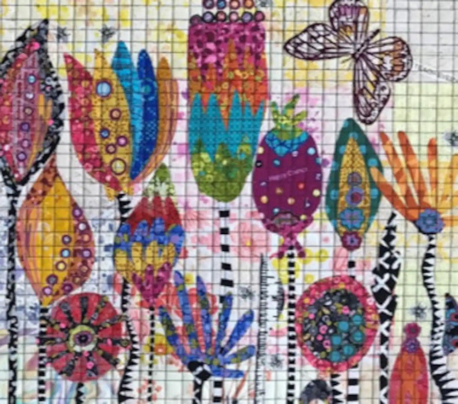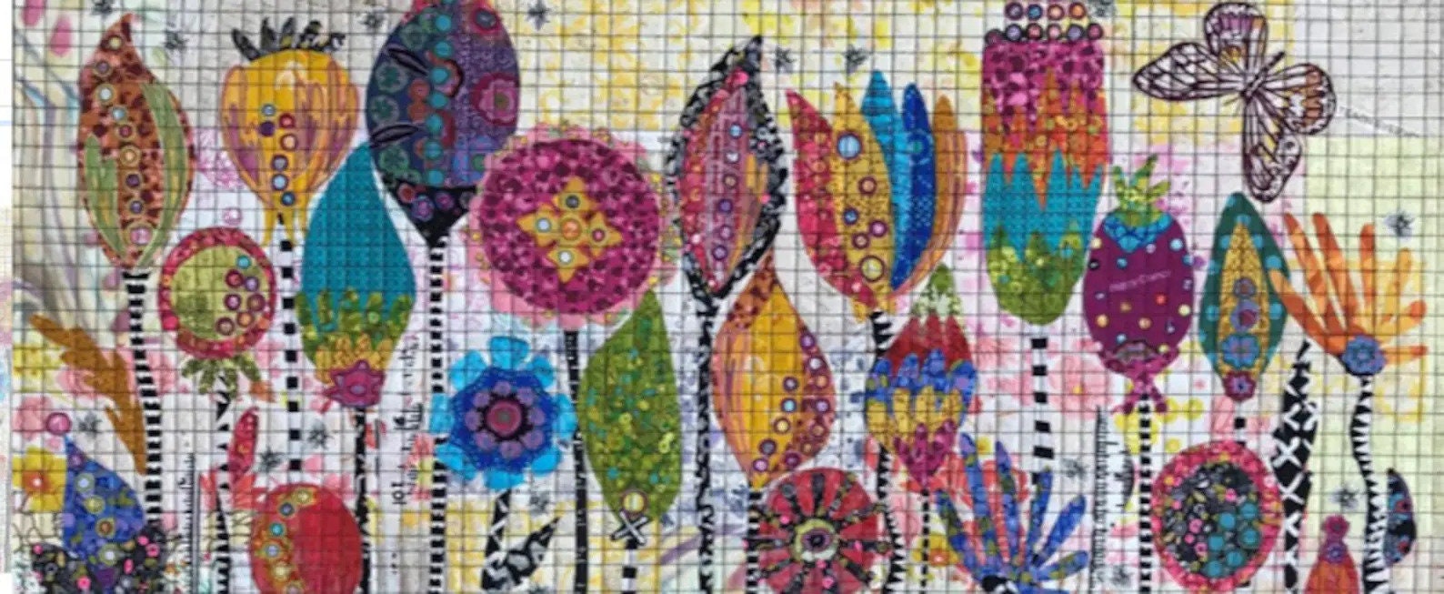 Seed Pods Collage Pattern by Laura Heine. Colors include golds, pinks, fuschias, greens, teals, oranges, purples and blue. This pattern includes color photos and step by step instructions. Finished size 34in x 24in.