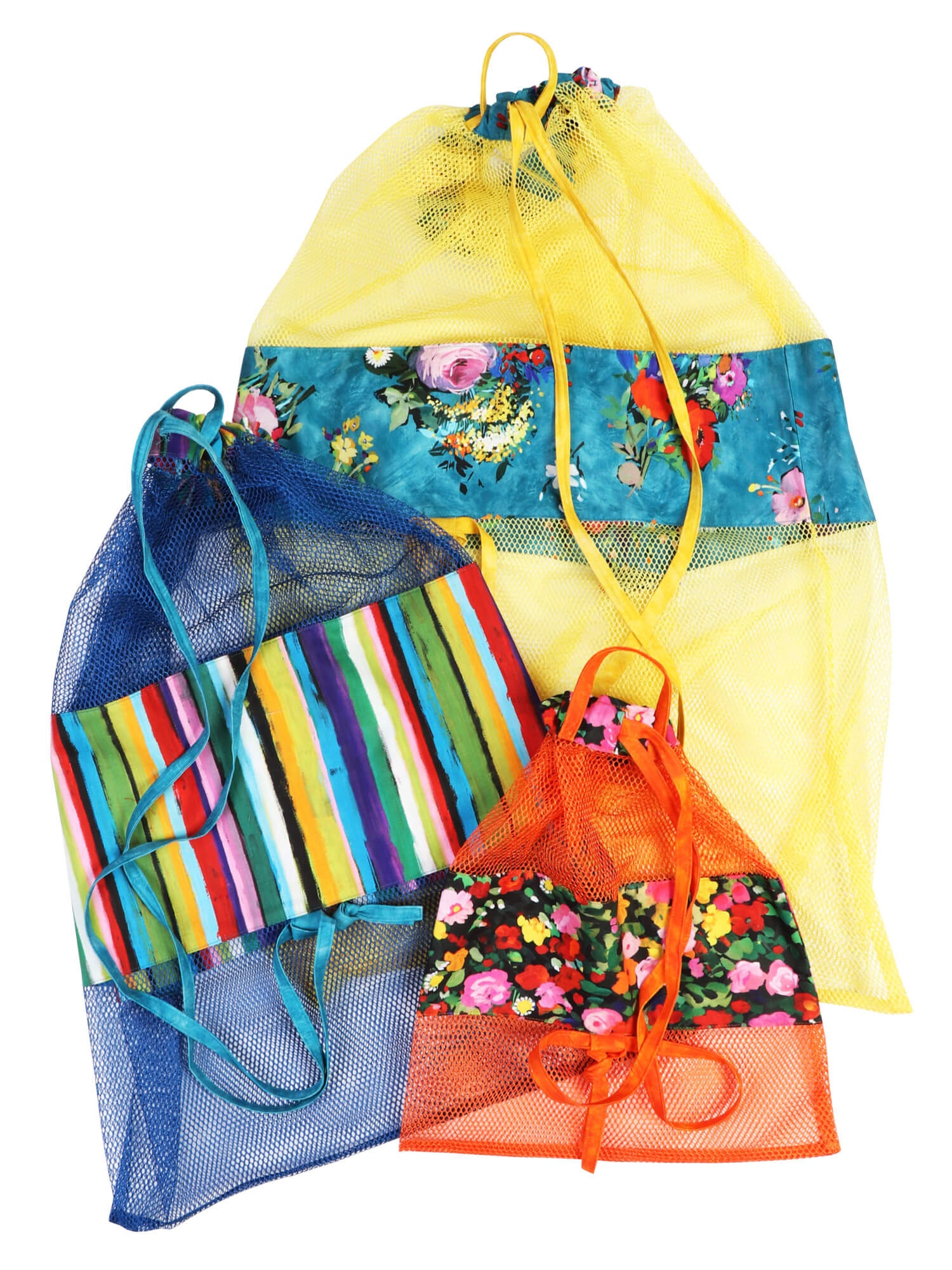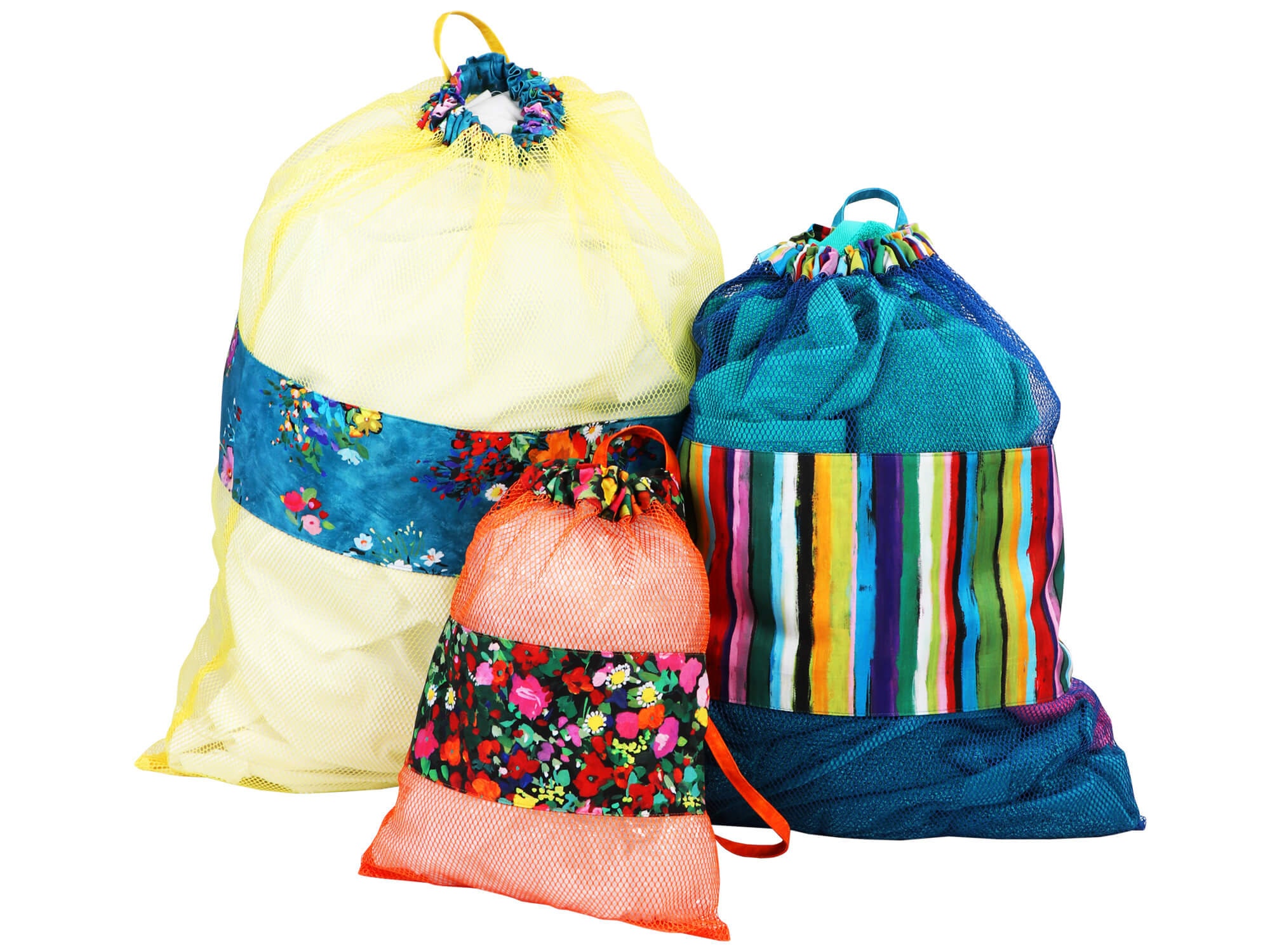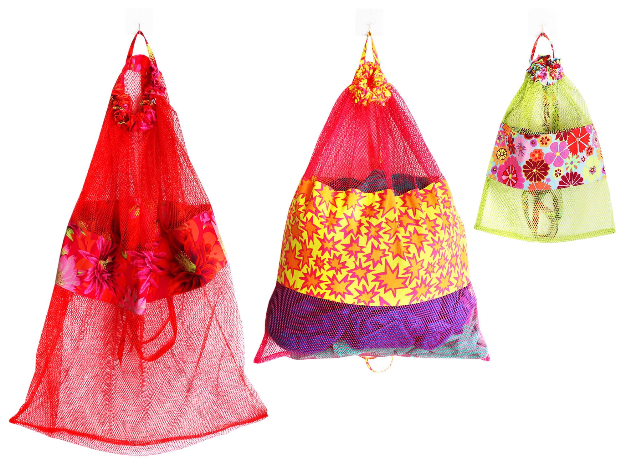 Perfect for gifts, the bags can be personalized for each recipient. Choose mesh and fabrics in school or team colors for students or sports fans. Consider using different mesh colors on top and bottom for even more variety.
