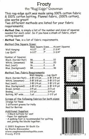 Frosty a rag-edge quilt, was made using 100% cotton fabric & 100% cotton batting. Flannel fabric, (100% cotton), also works great! Finished size Lap 55in x 71in and Or Wall Hanging 35in x 45in
