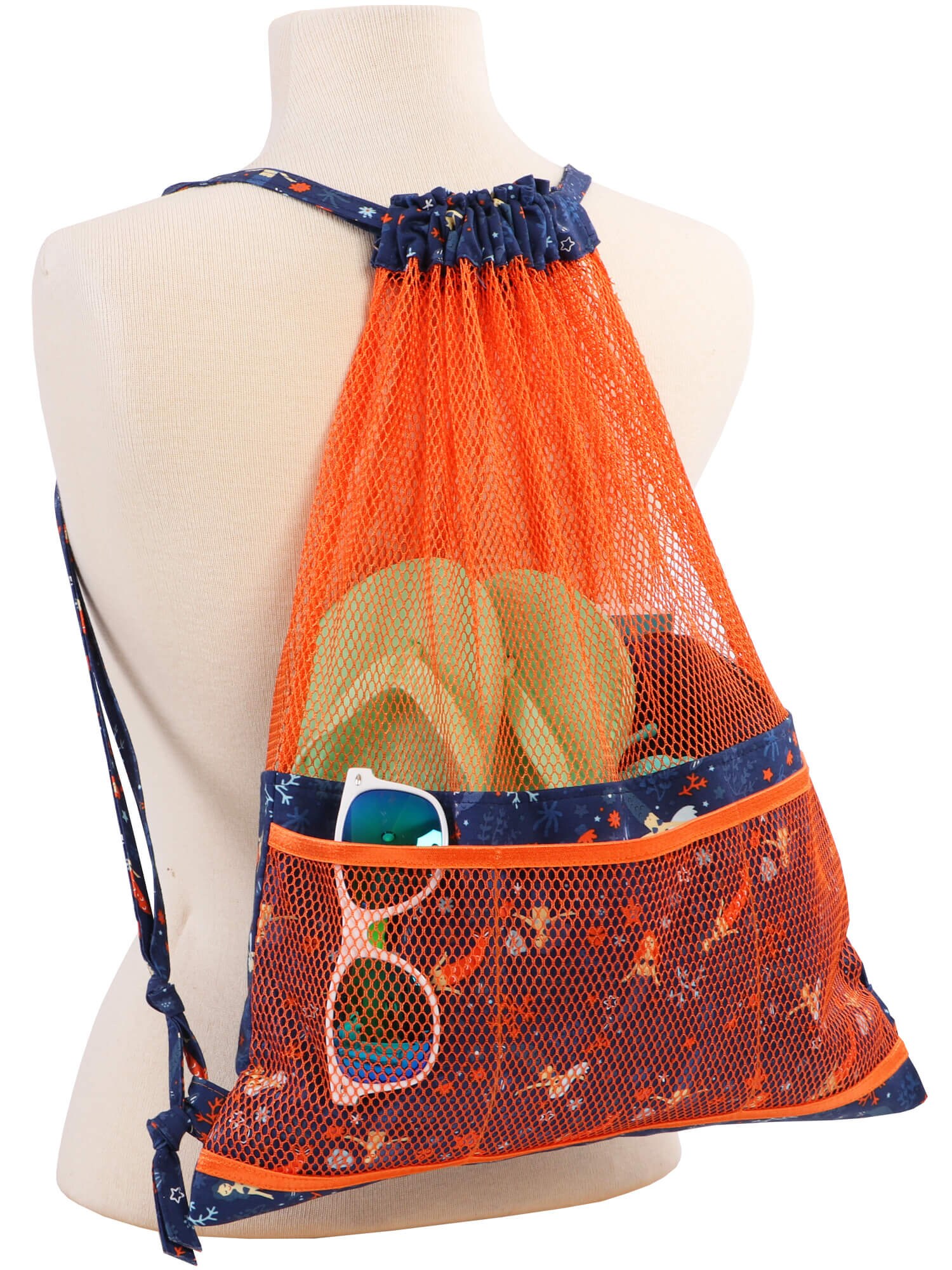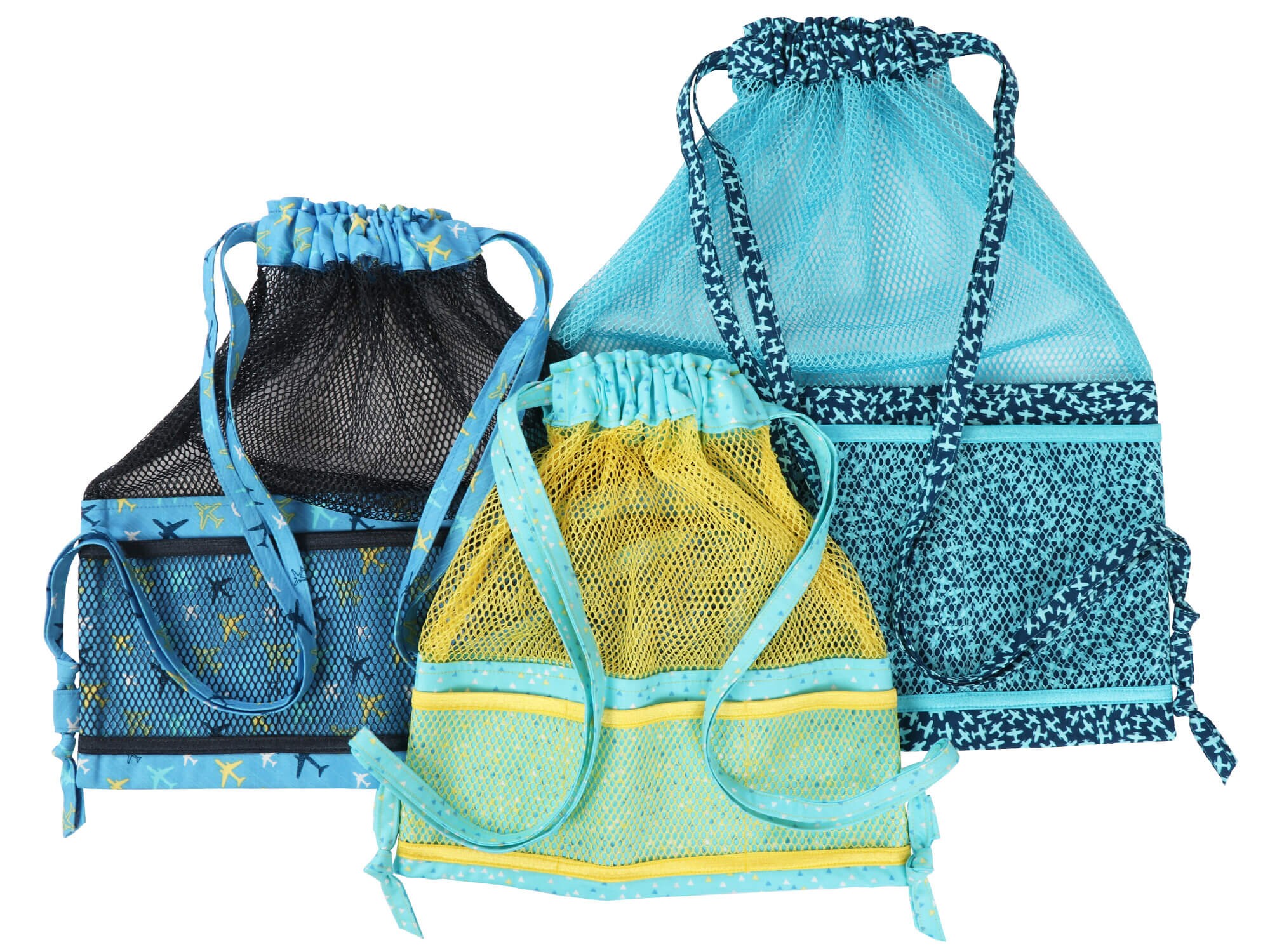 Lightweight drawstring backpacks made with mesh and fabric are easy to make and perfect for carrying everything from swimsuits and pool toys to dance or workout gear.