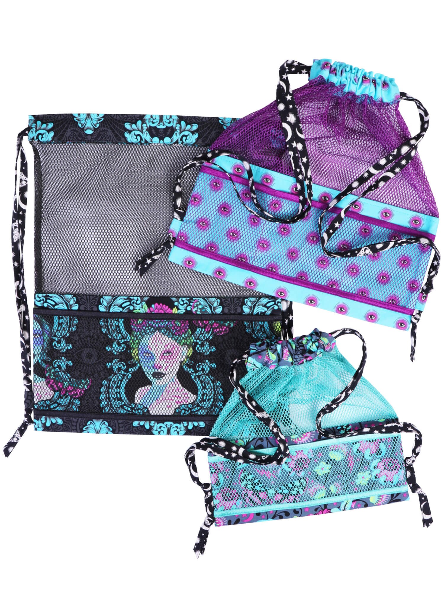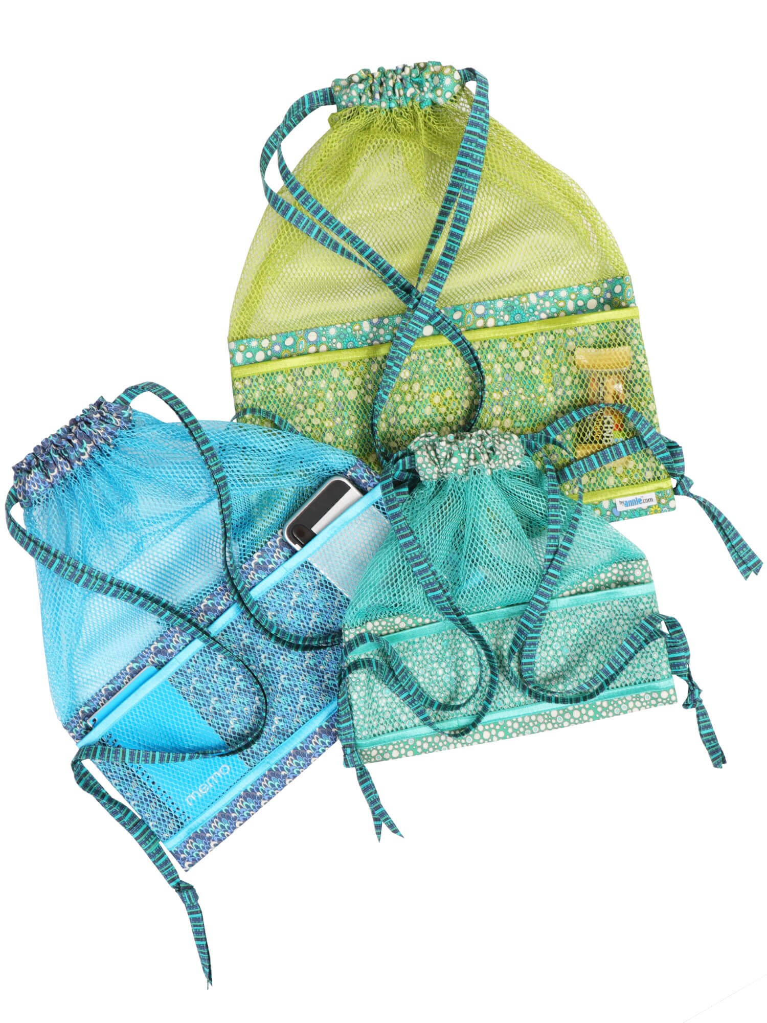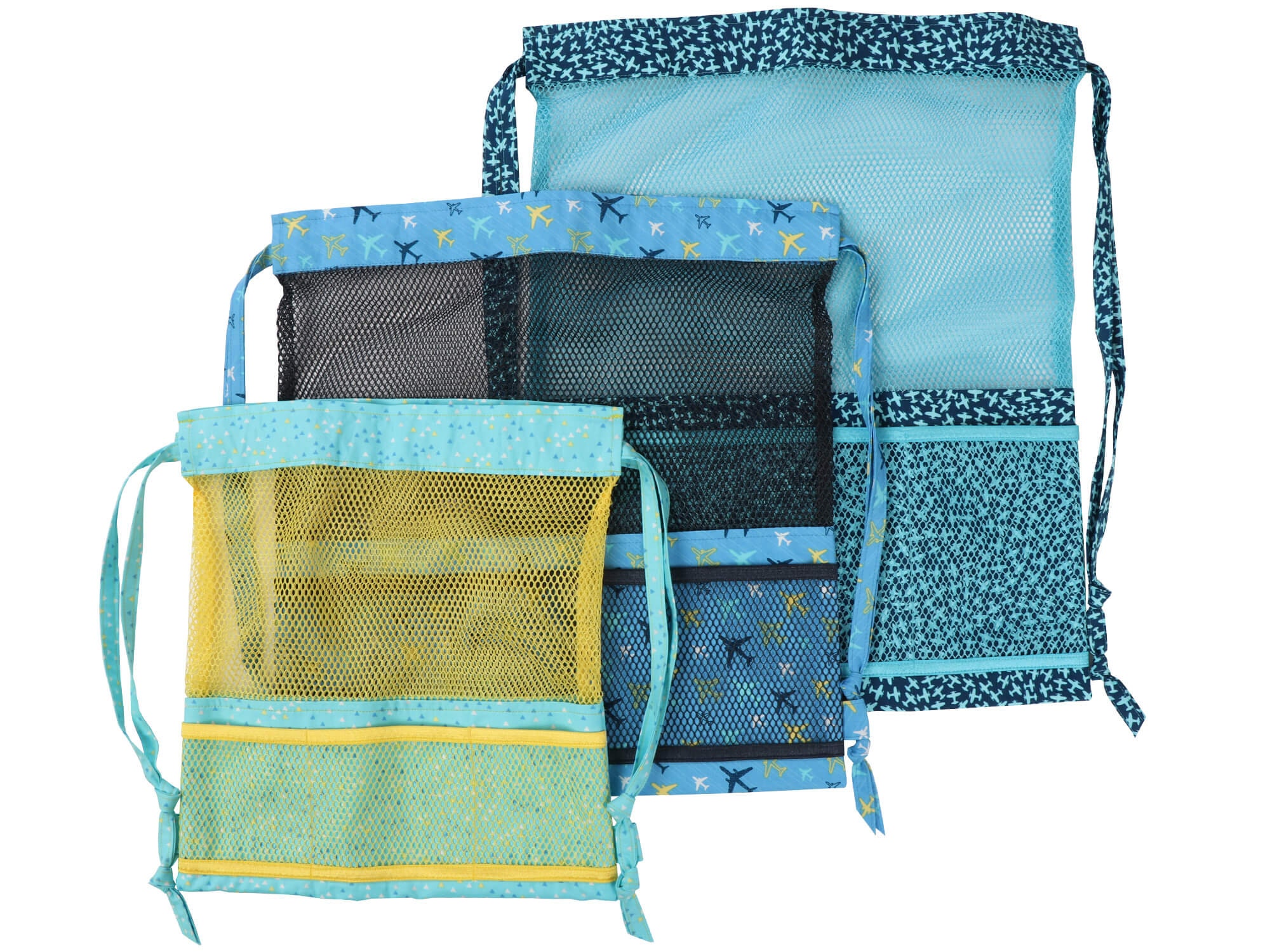 Breathable mesh provides ventilation and visibility of contents, and fun fabric bases add sturdiness, color, and interest. Mesh slip pockets on the front keep essentials easy to reach.