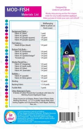 Liberated curvy stitching, wonky strip piecing and large easy to fuse machine appliqué shapes make this cool school of ModFish fun to stitch! No special rulers needed for the curved or wonky piecing and the pattern includes all the full size appliqué shapes as well as detailed directions and full color diagrams.