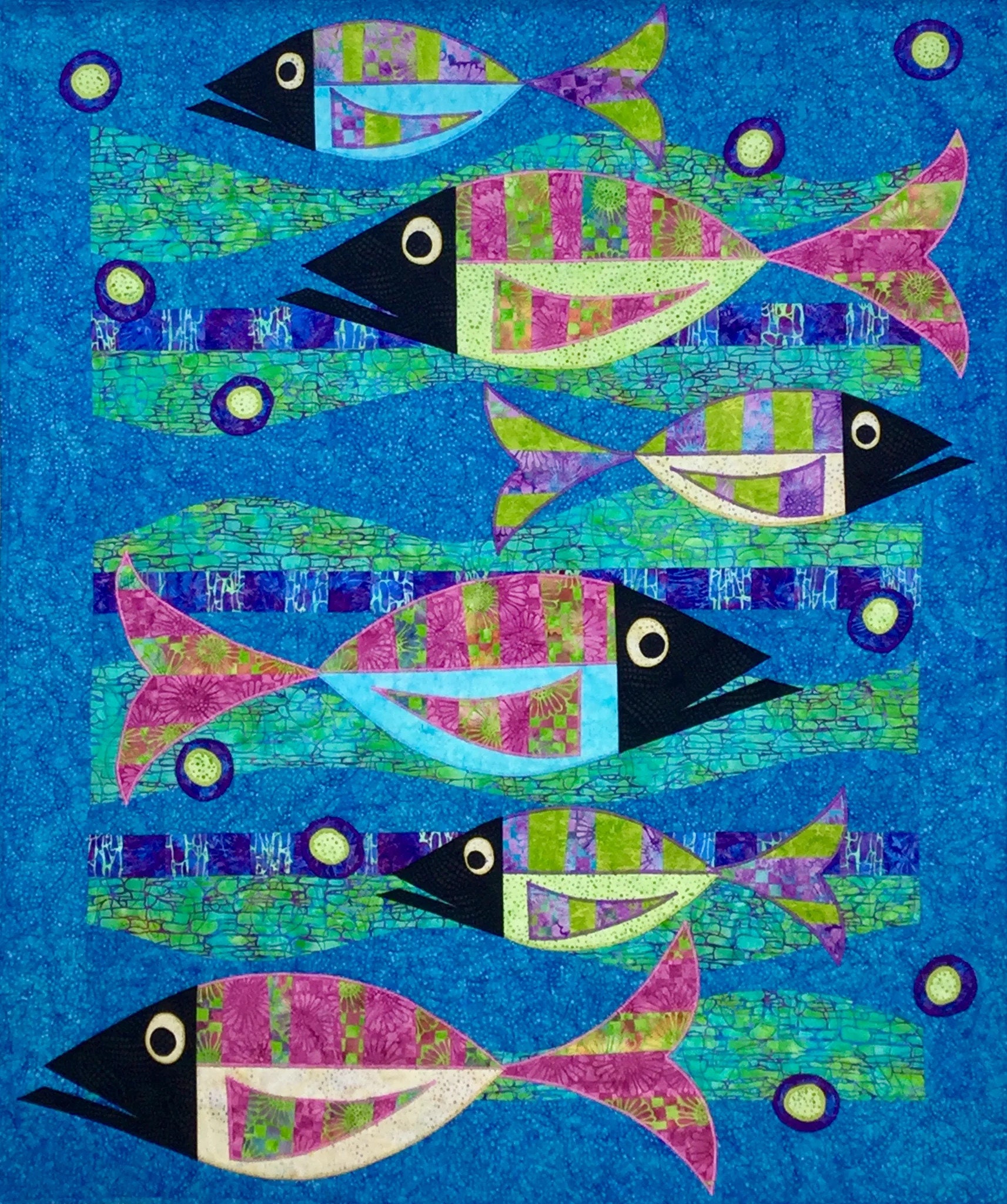 *Wonky strip piecing and easy appliqué shapes make this cool school of Mod Fish fun to stitch.