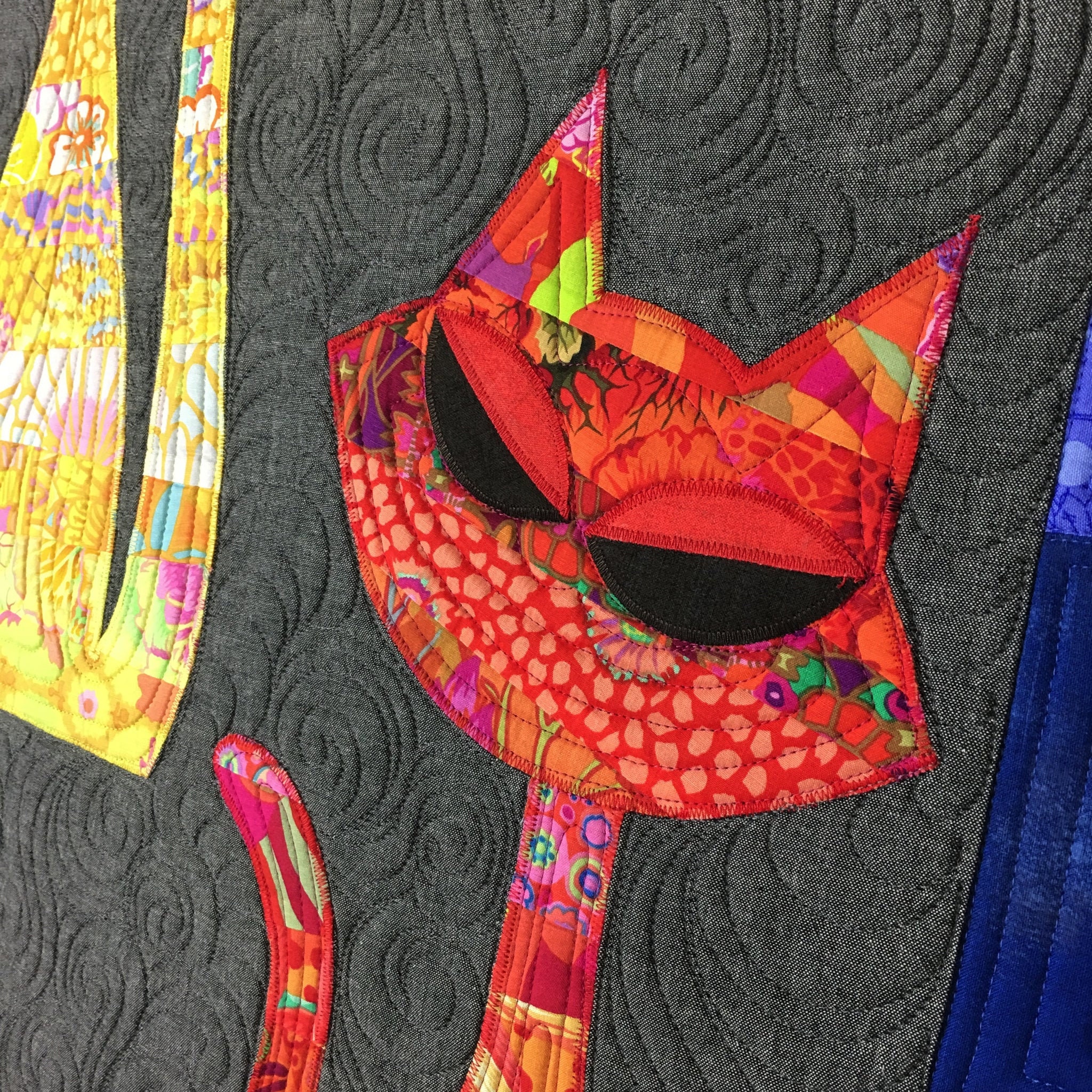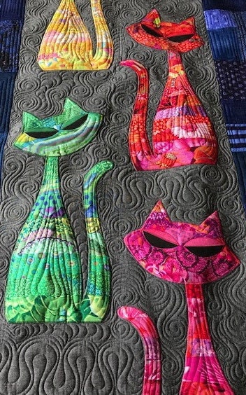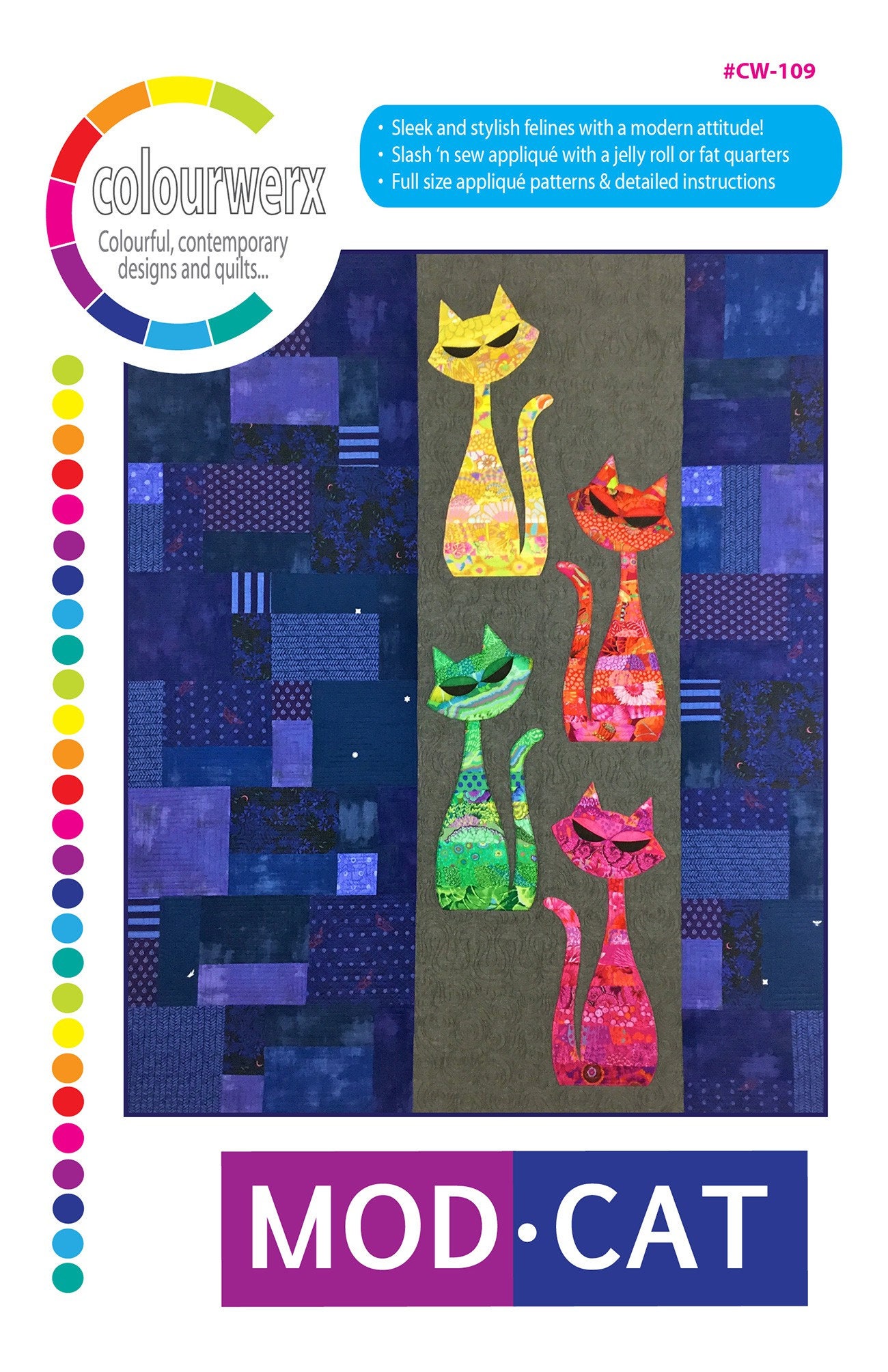 Liberated slash ‘n sew strips come together to form these stylish and sublime appliquéd fancy felines with a modern attitude! Use scraps or 1/3 yard cuts to create the scrappy side borders and a jelly roll or fat quarters for the appliquéd cats! Finished size is 53" x 64". Fully illustrated and detailed color instructions, diagrams and photos included. Full Size pattern shapes enclosed - no enlarging necessary. #CW-109