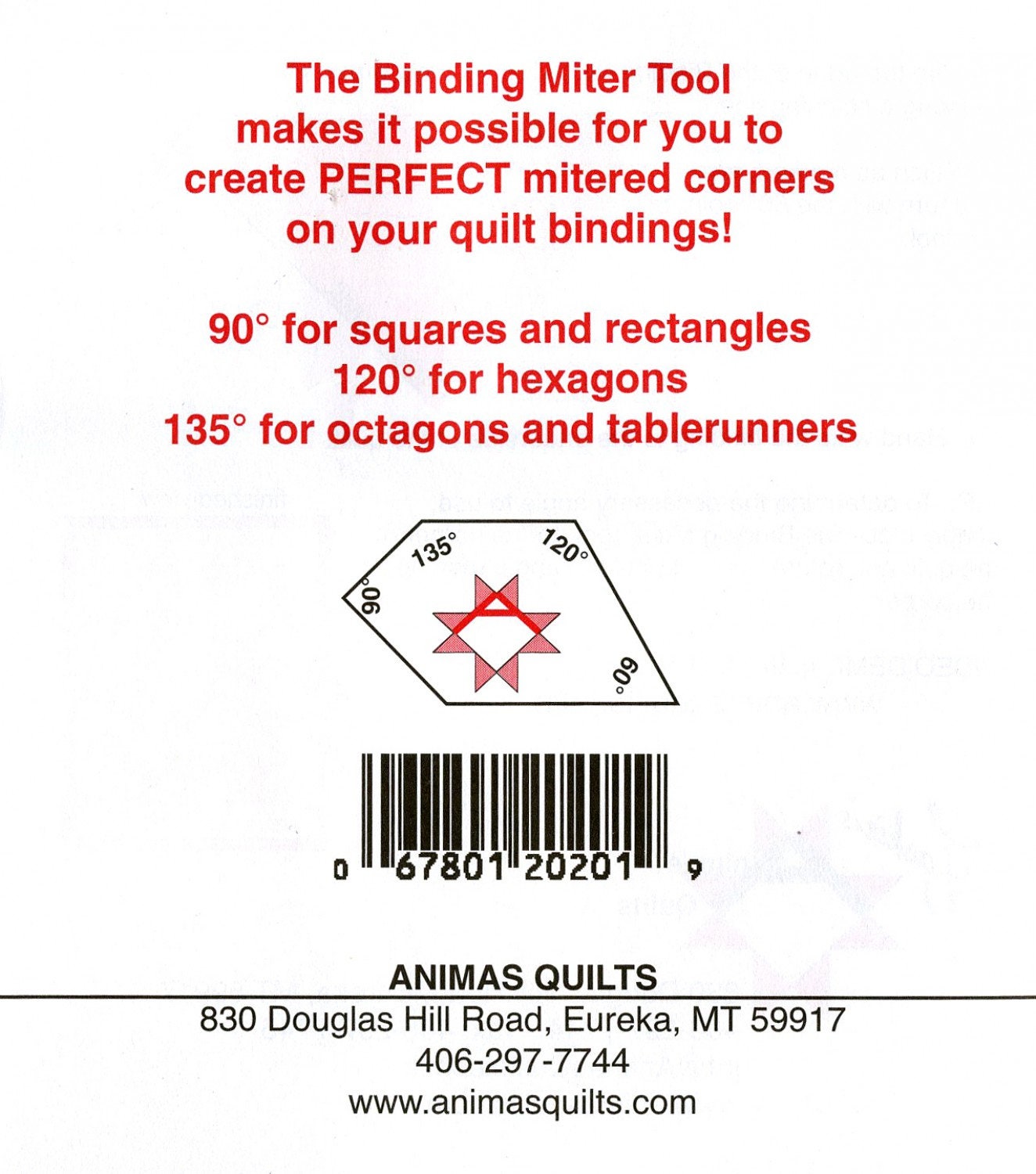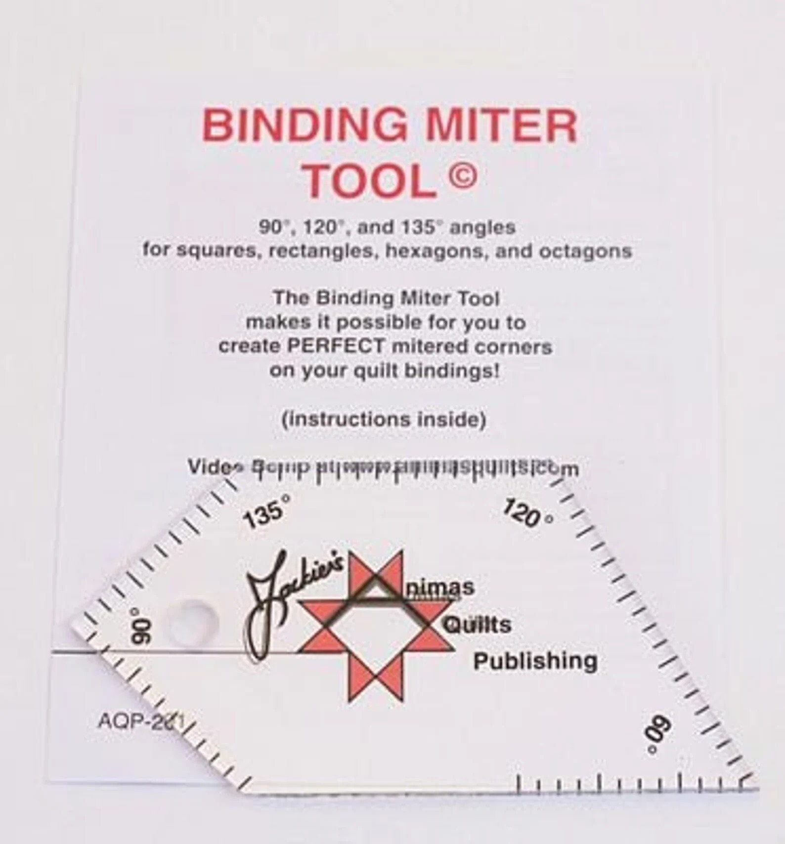 Makes mitered bindings on your quilts a snap! Comes with complete instructions for use. Has angles for typical Square and Rectangular quilts, as well as Hexagons, and Octagons (often the pointed end of a table runner)