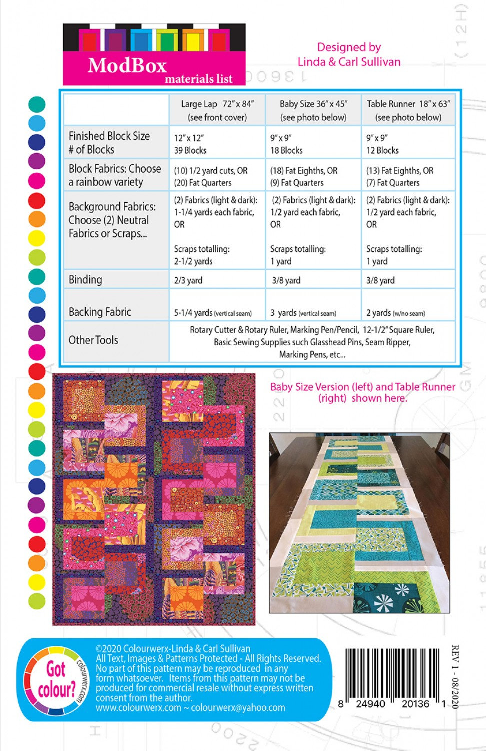 Choose 1/2 Yards or Fat Quarters. New, quick and easy ModBox pattern is so fun to piece and goes together in a snap! Looks great in solids or prints. Three sizes included - The Large Lap 72" x 84", the Baby Quilt 36" x 45", or a Table Runner 18" x 63". No special rulers or templates needed - the pattern includes detailed directions and full color diagrams. (#CW-136)