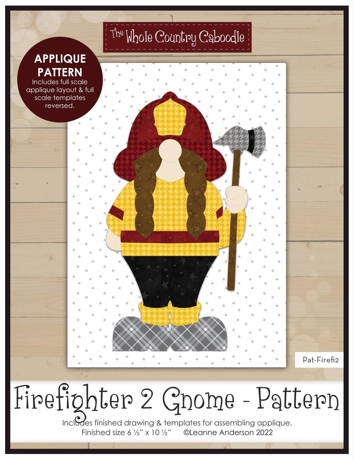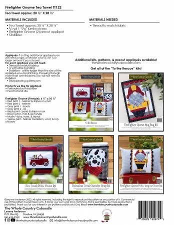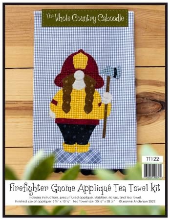 "Kit includes instructions, Firefighter Gnome (2) precut fused appliqué, stabilizer, ric rac, and tea towel.