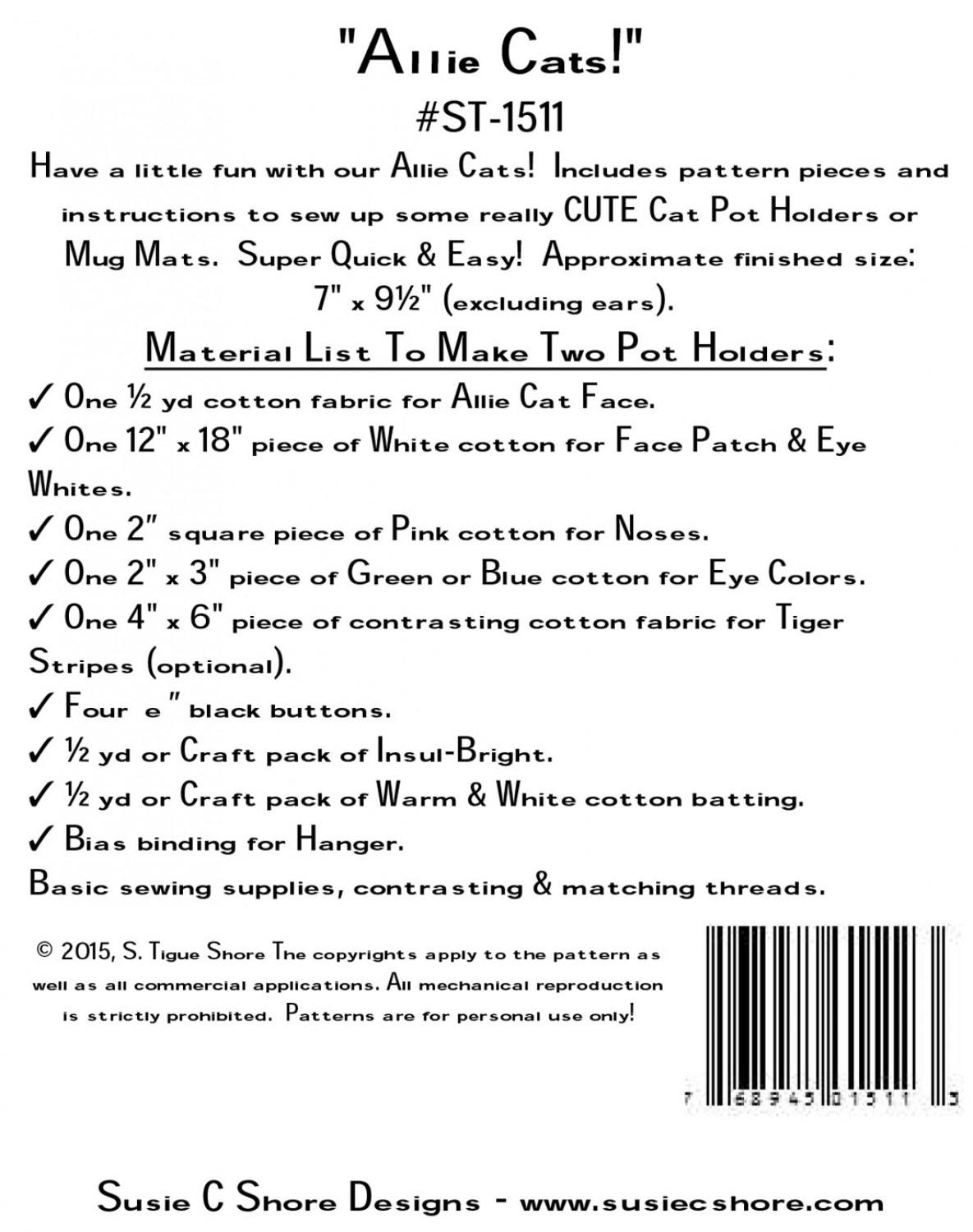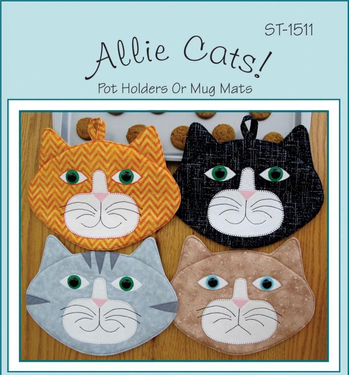 Have a little fun with our Allie Cats! Includes pattern pieces and instructions to sew up some really CUTE Cat Pot Holders or Mug Mats. Super Quick & Easy! Approximate finished size: