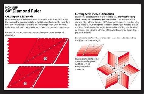 Use this mini 60 Degree Diamond Ruler to cut diamonds, hexagons, and triangles, and 120 degree side-setting triangles up to 4-1/2in.