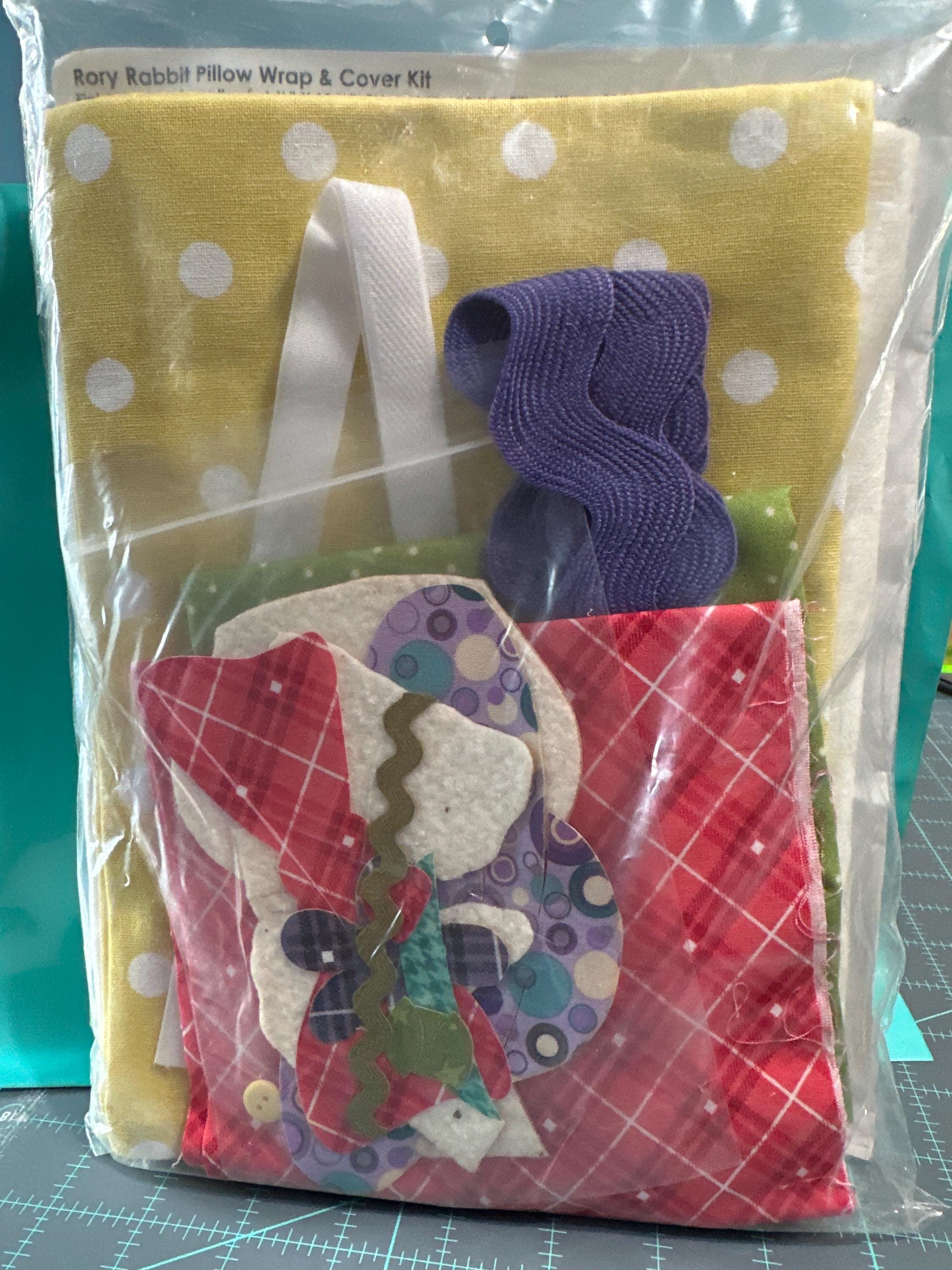 Kit includes pillow wrap and cover instructions, precut fused applique, notions, fabric, single sided fusible foam batting, ric rac, hook and loop tape, and tea towel for pillow cover & wrap.