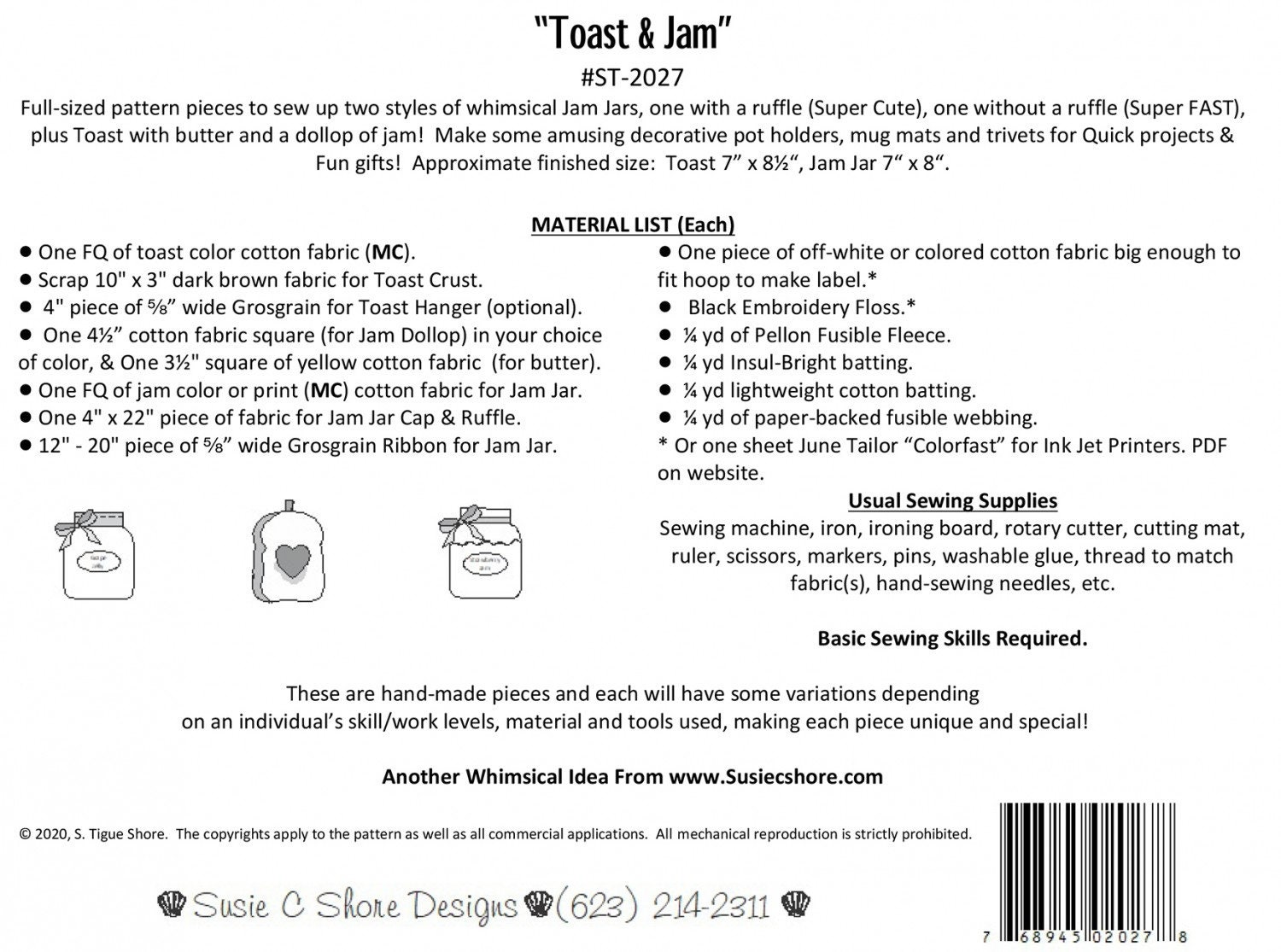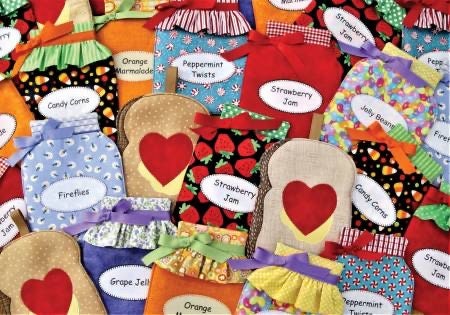 Full-sized pattern pieces to sew up two styles of whimsical Jam Jars, one with a ruffle (Super Cute), one without a ruffle (Super FAST), plus Toast with butter and a dollop of jam! Make some amusing decorative potholders, mug mats, and trivets for Quick projects and fun gifts! Approximate finished size: Toast 7” x 8½“, Jam Jar 7“ x 8“.
