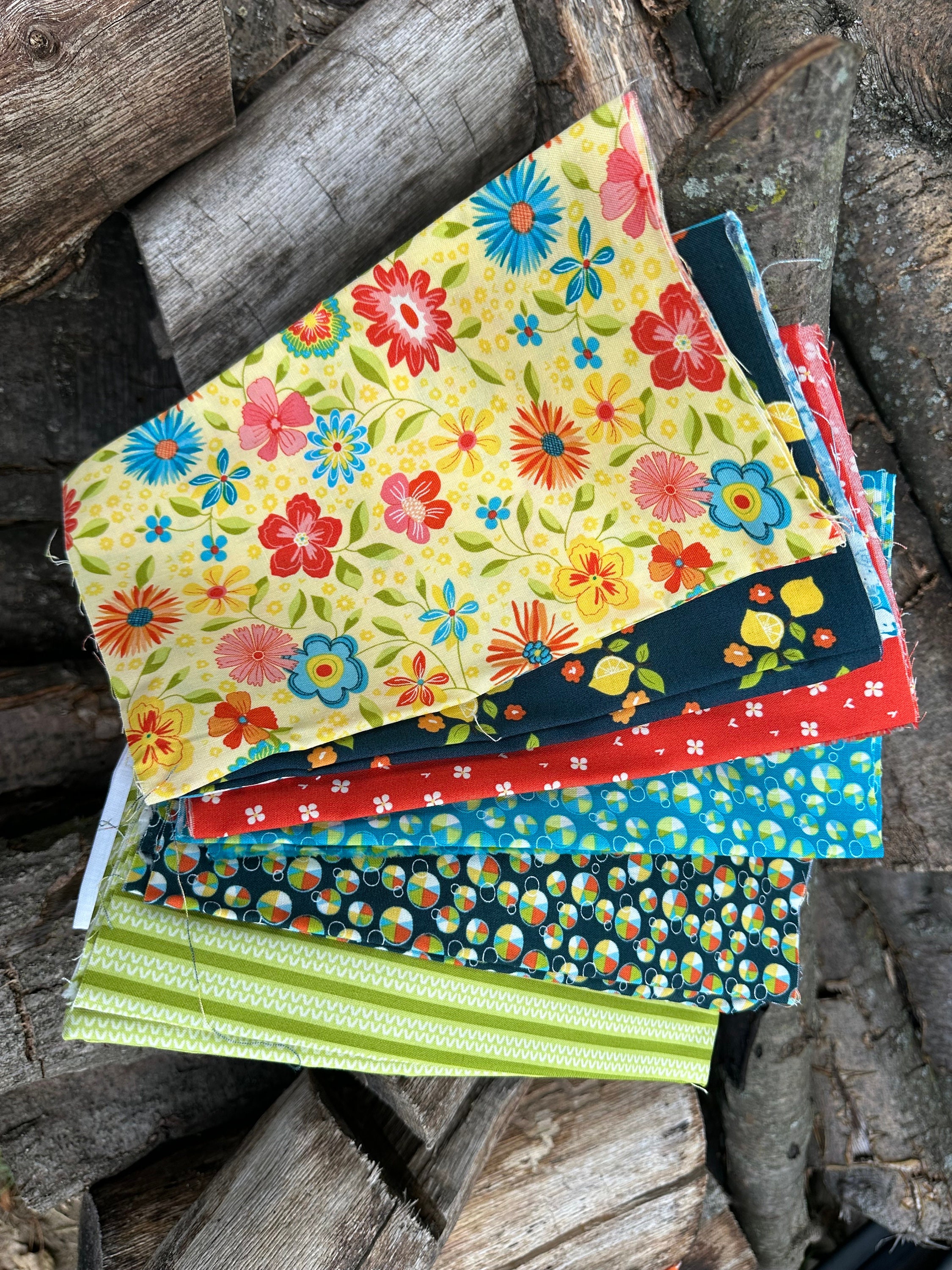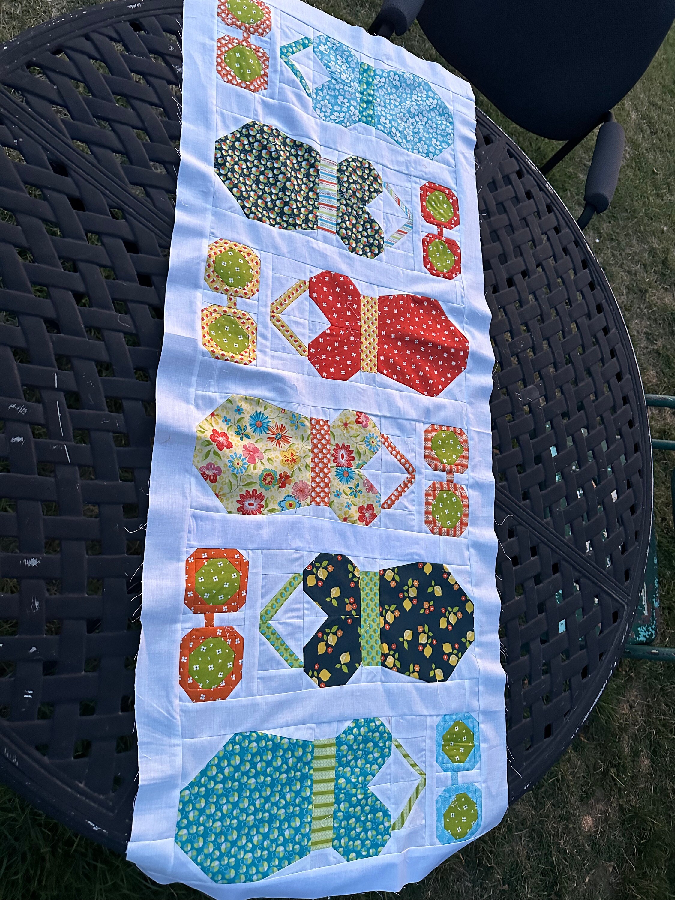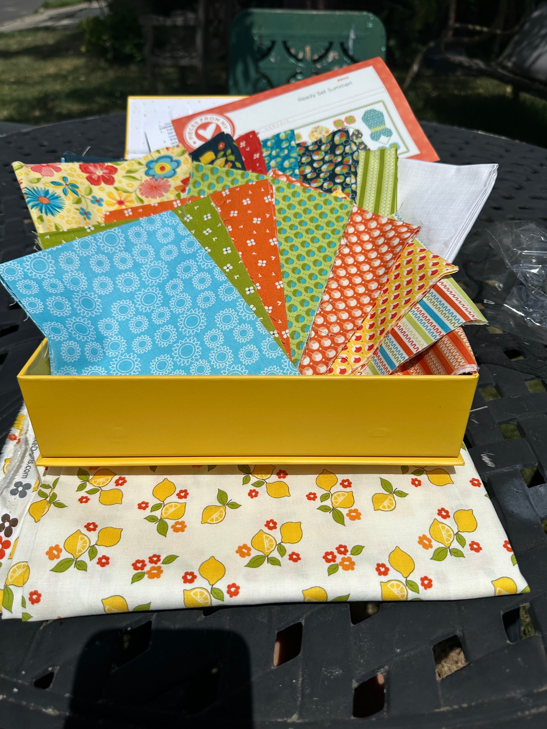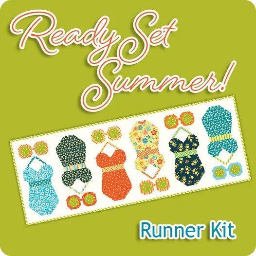 This cute runner! Kit includes the Ready Set Summer! Runner Pattern by Pieces from My Heart and Here Comes the Sun by Sandy Gervais fabrics for the 16.75" x 45.5" quilt top and binding, all packaged in a 6" x 10" x 2.5" keepsake box.