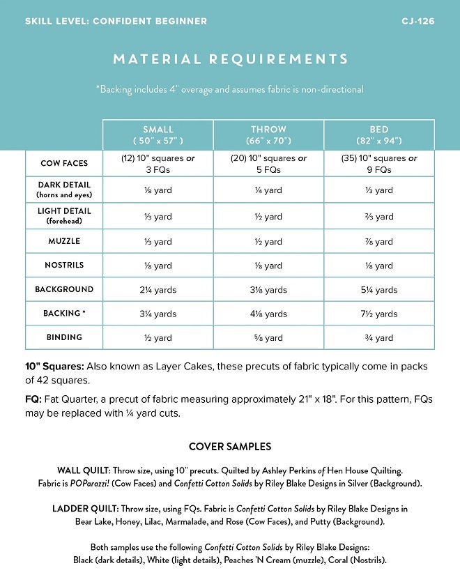This traditionally pieced quilt pattern features a playful and modern cow design. You can let your imagination run wild with two fabric options: layer cakes or fat quarters. Plus, there are three available sizes: small, throw, and bed. Here are the details: