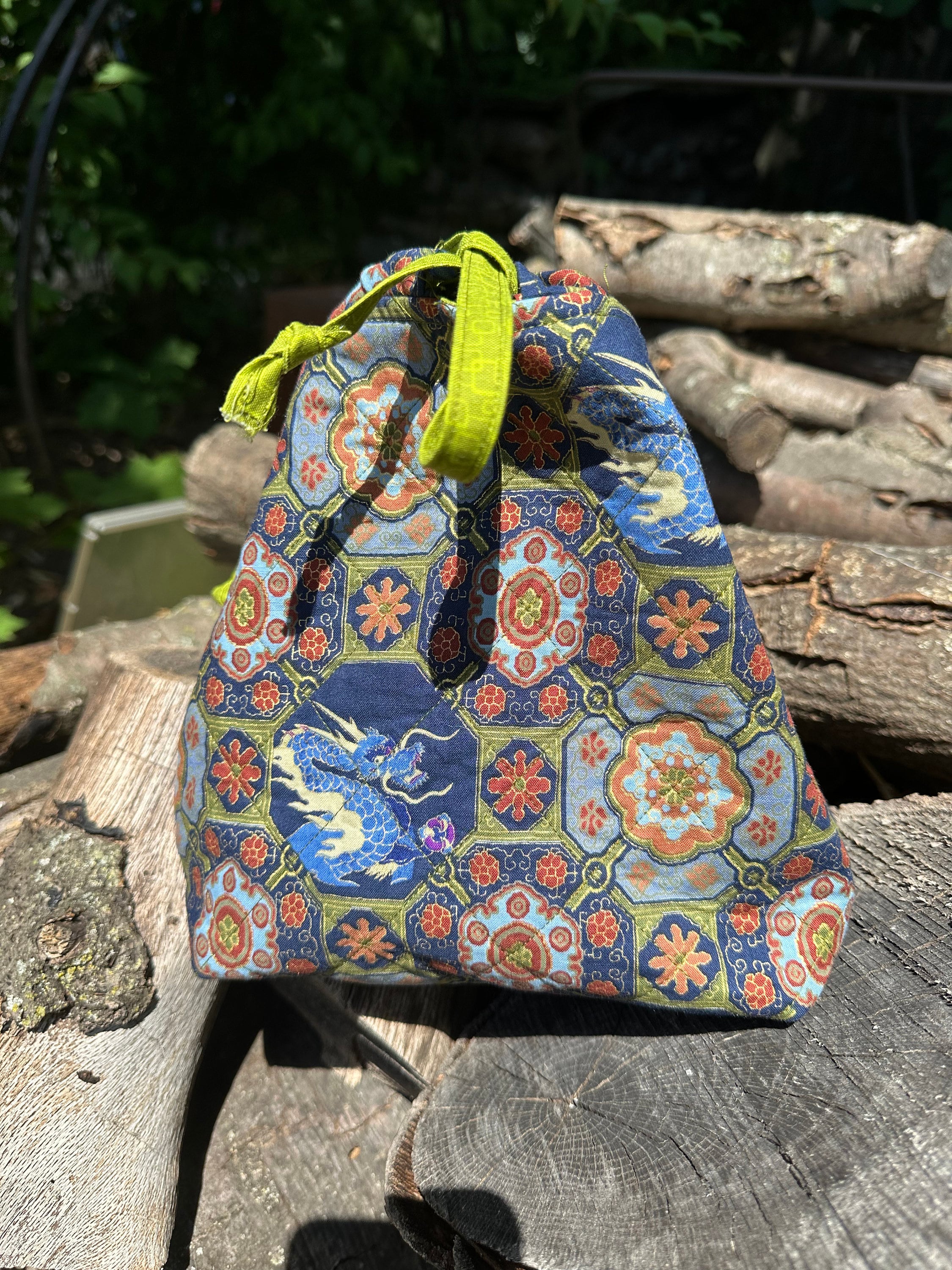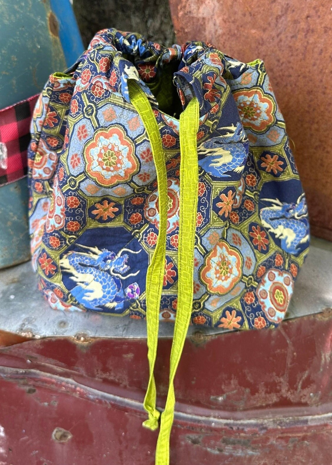 A rice bag is what the Japanese use to take rice to the temple for an offering or to take to the market the fill with rice. This is a takeoff of those bags. It is made with large 2" hexagons and a little simple big stitch quilting if you like. It can also be made with scraps of fabric or yardage. You can use it for sewing supplies or anything you desire.