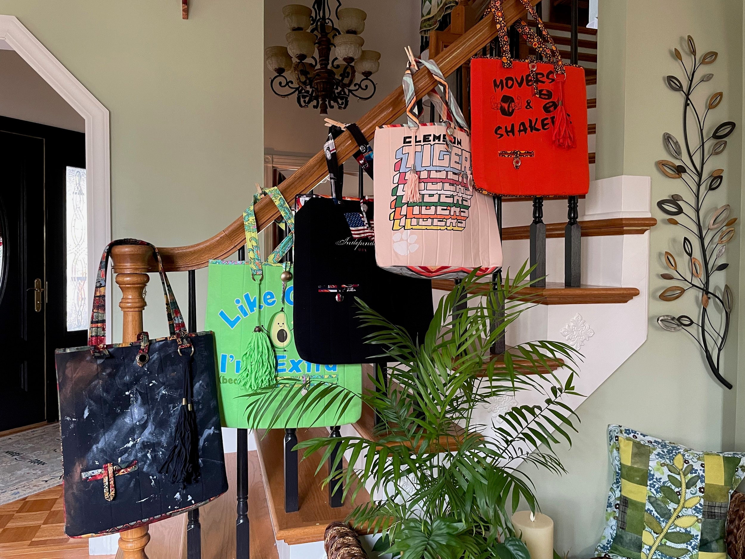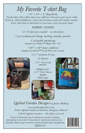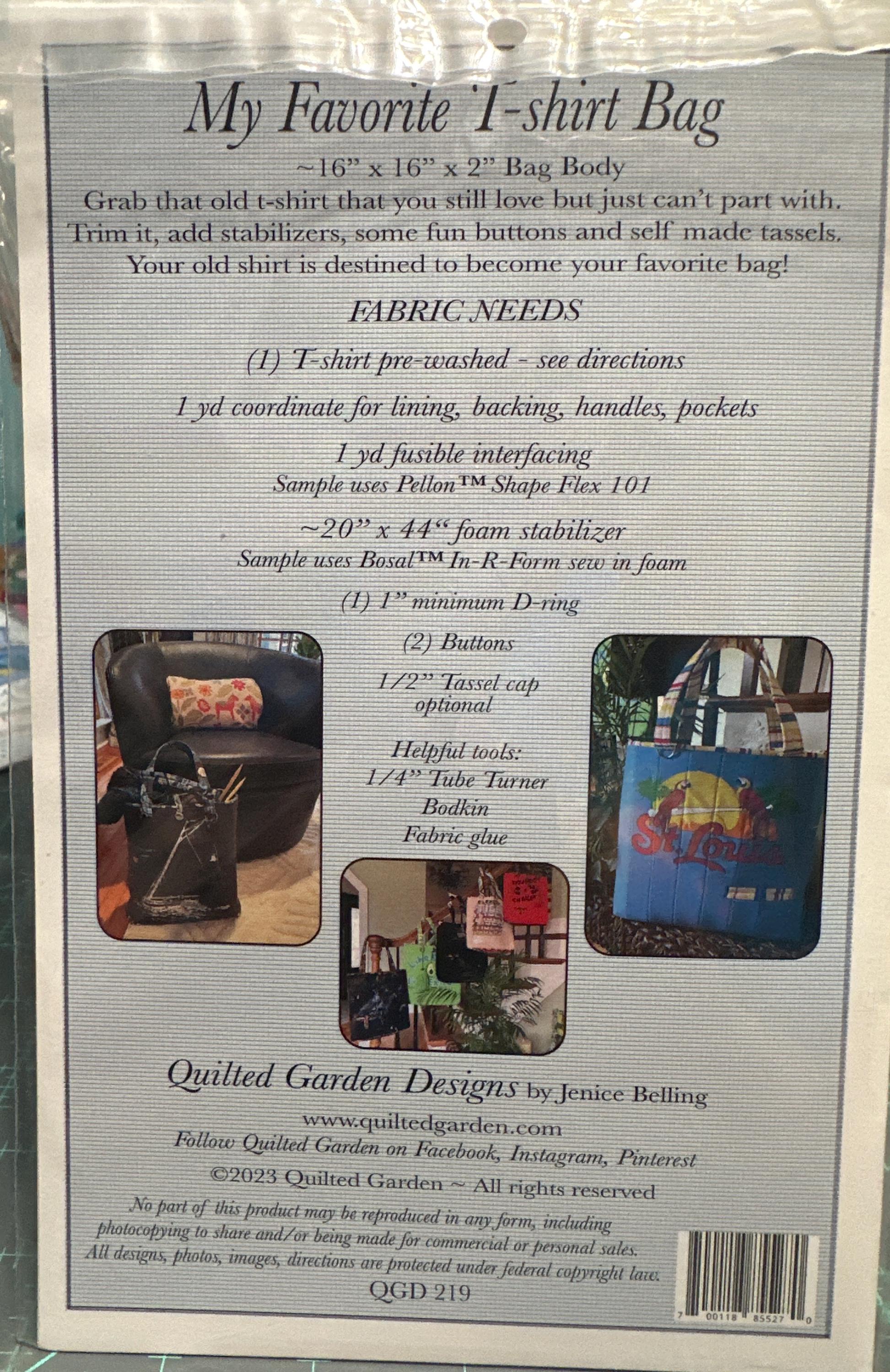 Grab that old t-shirt that is a favorite but not being worn! Trim, add stabilizers, buttons, and your own creativity to transform it into the perfect bag. Learn how to make a welt pocket, flat boxed bottom, button tabs and finish with a self made tassel. Directions are included for all!