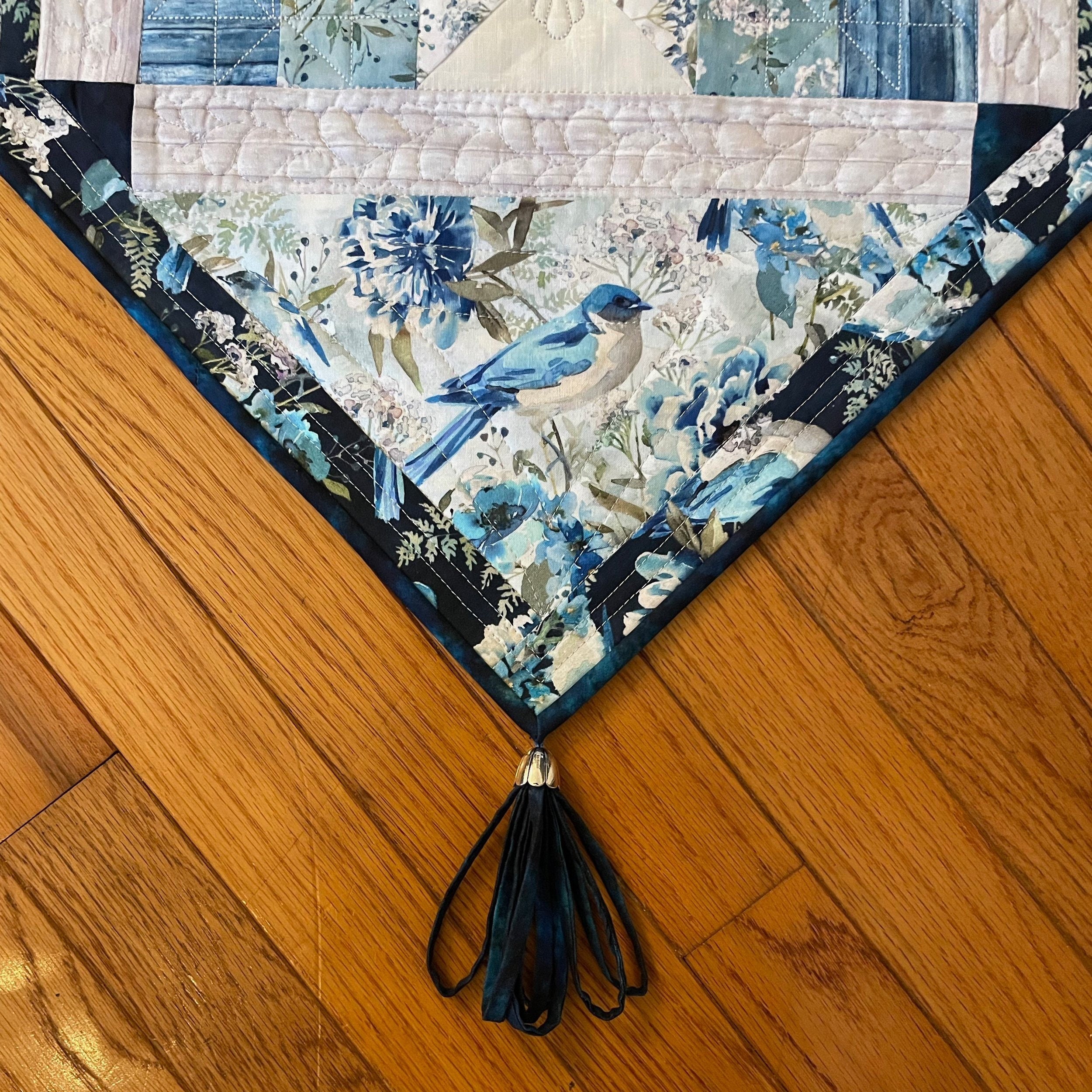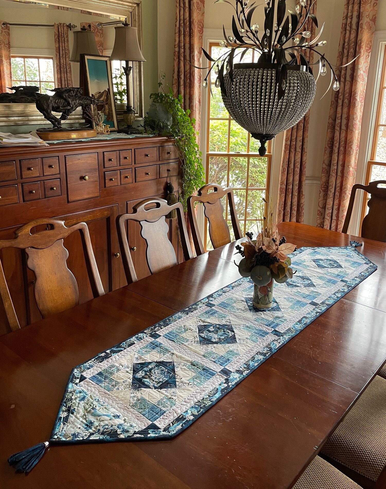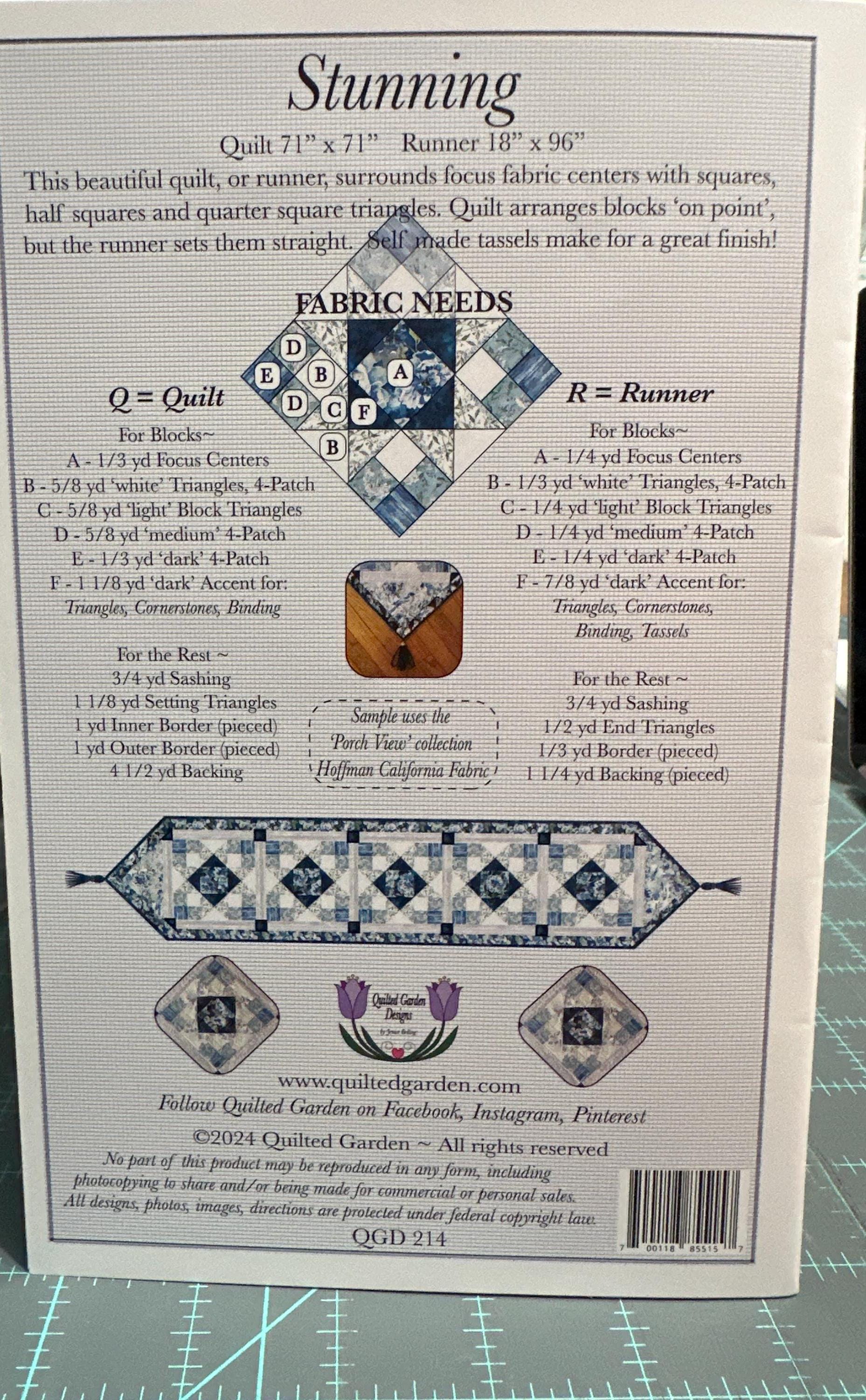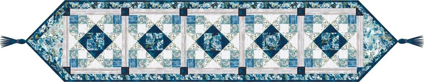 Quilt 71"x71" Runner 18"x96" (including tassels). Traditional blocks are set 'on-point' in the quilt, but straight-on in the runner. Rotary cut squares, triangles and borders are familiar and perfect for the new or experienced quilter. The classic blocks come together to create this stunning quilt, runner, or both - directions are all-inclusive. Self-made tassels make for a fun finish.