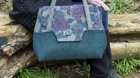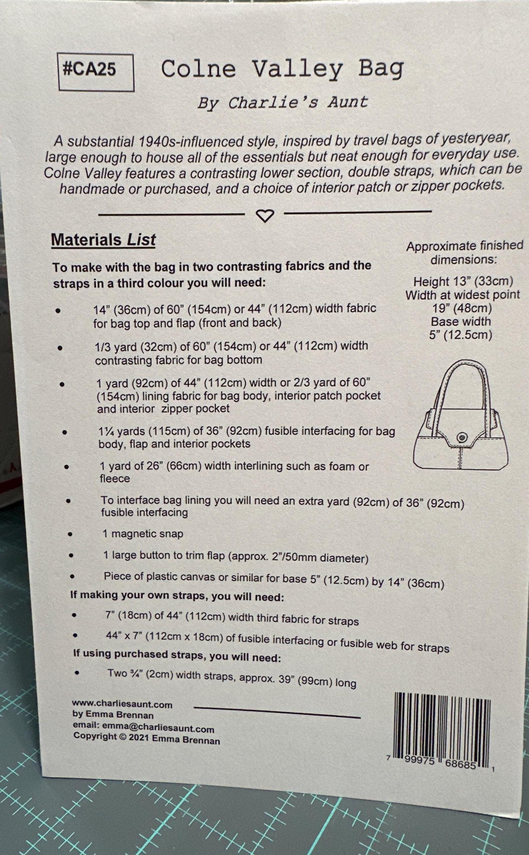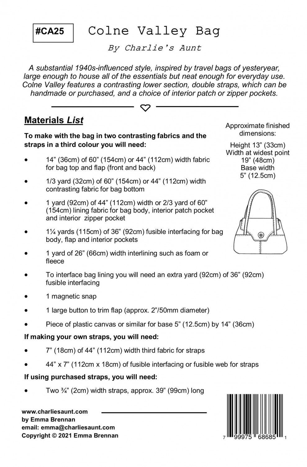 The Colne Valley Bag is inspired by travel bags of yesteryear, a substantial 1940s-influenced style. Large enough to house all of your essentials but neat enough for everyday use, Colne Valley features a contrasting lower section, double straps (handmade or purchased), interior patch pocket and interior zipper pocket. This style makes up well in everything from woolen tweeds, flannel or coating weight fabric to decorator weight fabrics. The Colne Valley Bag’s approximate finished dimensions are: Height 13” (33cm), width at widest point 19” (48cm), base width 5” (12.5cm), length of straps approx. 39” (100cm). Ten pages of instructions plus full-sized pattern pieces