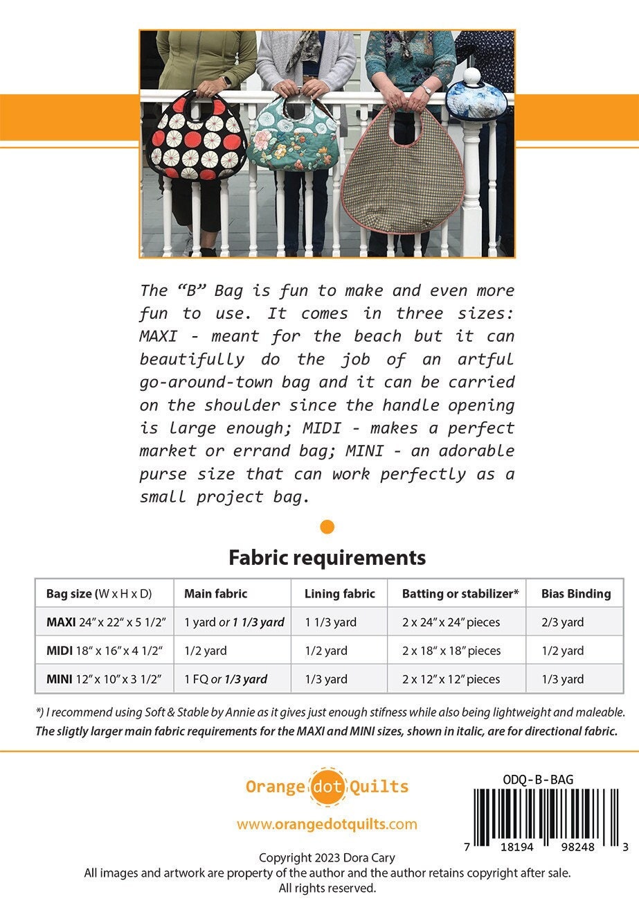 The “B” Bag is fun to make and even more fun to use. It comes in three sizes: MAXI - 24" x 22" x 5 1/2" - is meant for the beach but it can beautifully do the job of an artful go-around-town bag and it can be carried on the shoulder since the handle opening is large enough; MIDI - 18" x 16" x 4 1/2" - makes a perfect market or errand bag; MINI - 12" x 10" x 3 1/2" - is an adorable purse size that can work perfectly as a small project bag.