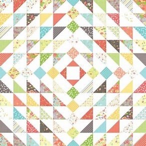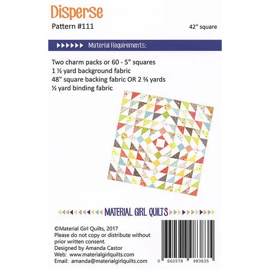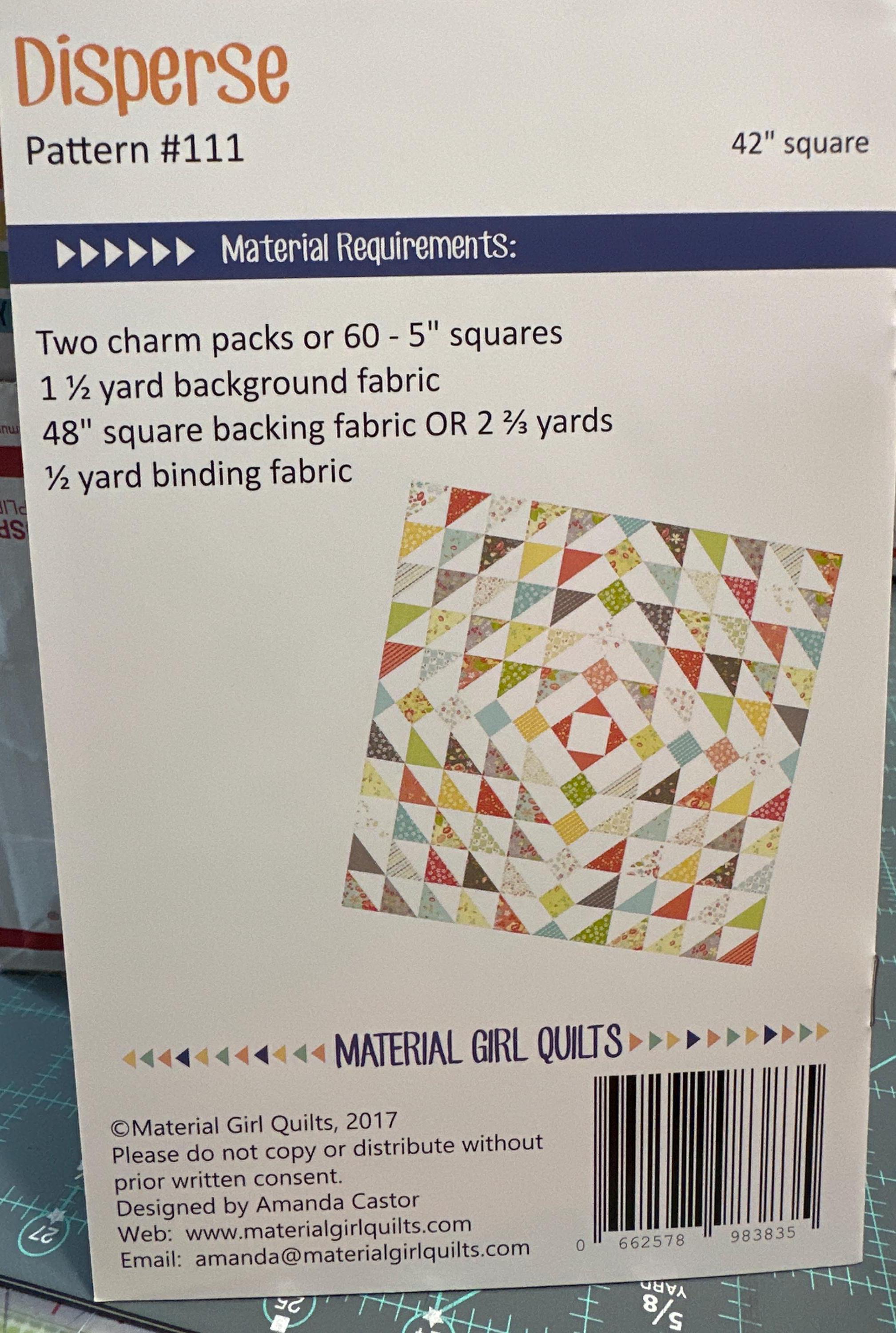 The Disperse Quilt by Amanda Castor of Material Girl Quilts is the perfect baby/toddler sized quilt. Use pre-cut 5" stackers for a quicker finish or raid your scrap bin for 60 - 5" squares. Play around with background fabric colors to make a striking quilt that will be treasured for years. Finished size is 42" x 42".