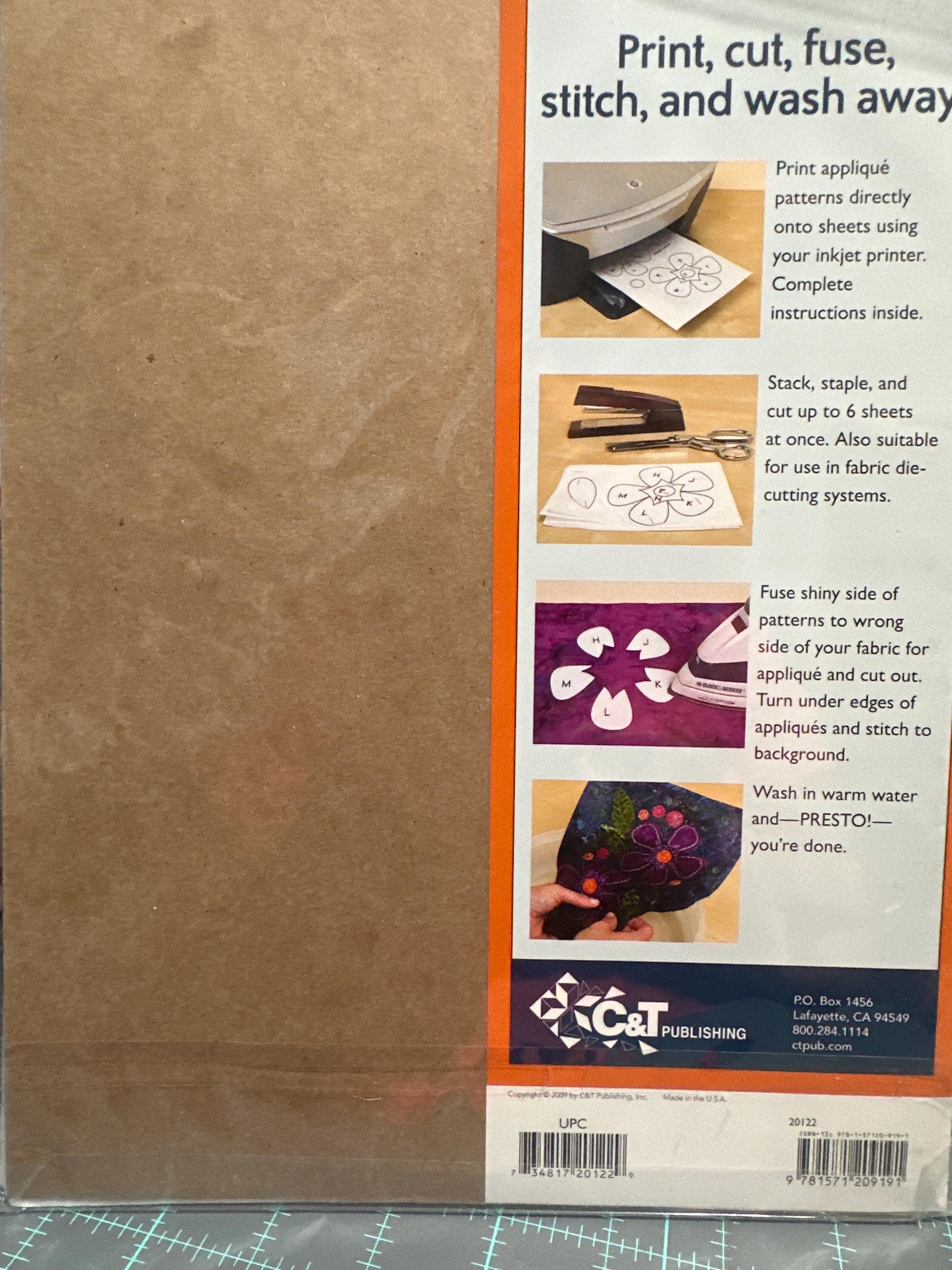 8-1/2in x 11in Printable Water Soluble, Single-Sided Fusible Eco-Friendly. Draw applique motifs or print them on these handy sheets with an ink-jet printer, fuse the paper to your applique fabric, sew on the motif, then just wash away the paper after stitching. 15 sheets per pack