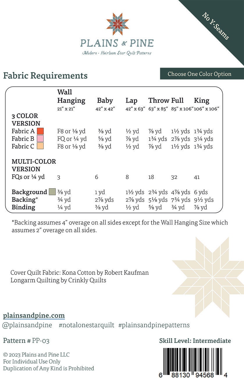 Original quilt pattern design by Lindlee Smith of Plains and Pine. This design is a variation on the classic Lone Star Quilt, but instead of a single star the Not Alone Star quilt is made up of multiple "lone" star blocks. Skill Level: Intermediate. This is an Intermediate quilt pattern because it involves accurately cutting and sewing on a bias, sewing with a consistent ¼” throughout, and precision when matching diamond points. Includes instructions for six sizes (Wall Hanging, Baby, Lap, Throw, Full, and King). The pattern includes a 3-color option and Multi-Color Version. There are no Y seams in this quilt pattern.