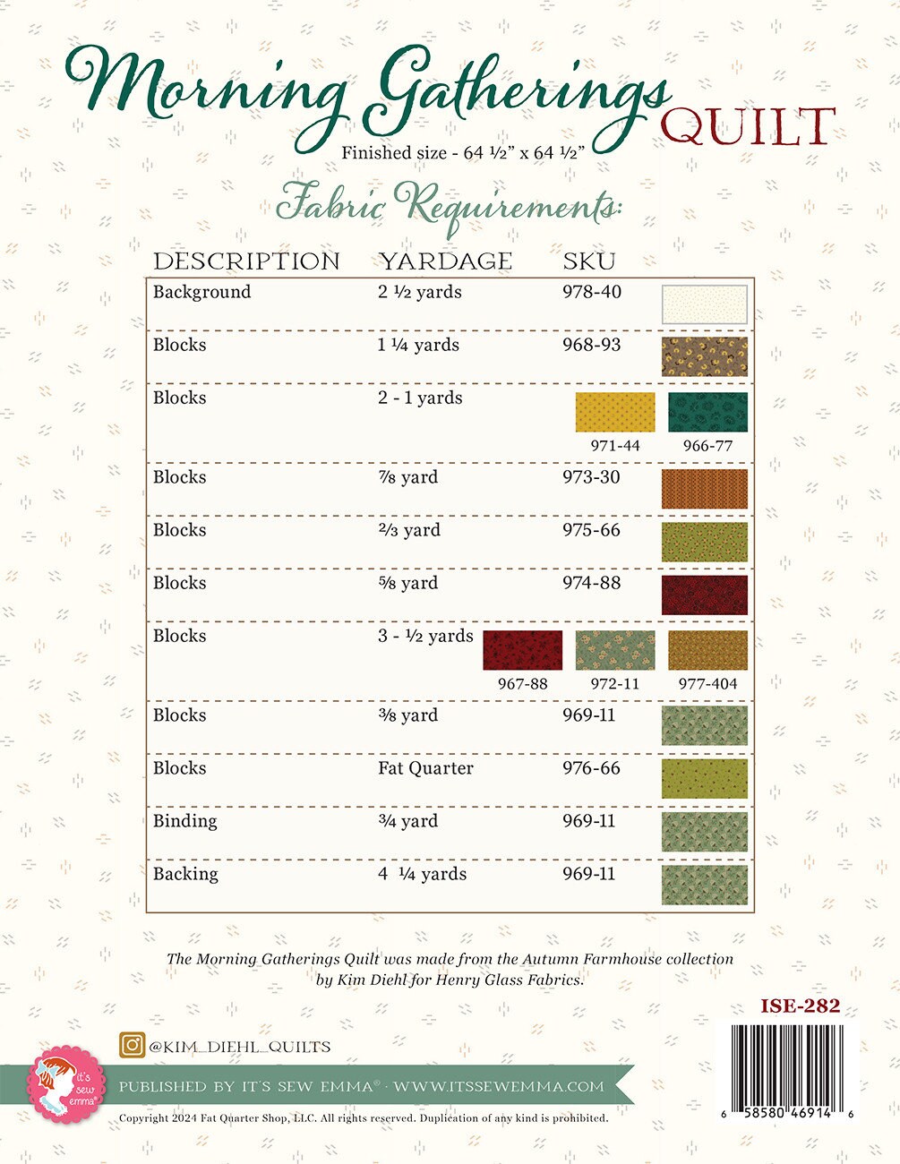 The Morning Gatherings quilt by Kim Diehl brings together the basic elements of quilting, such as the square in a square or flying geese and creates a kaleidoscope feast for the eyes. Once completed, you will spend hours rediscovering all the patterns hidden in this quilt. Take a few steps back and the rectangle becomes a circle. This quilt makes a strong visual statement.