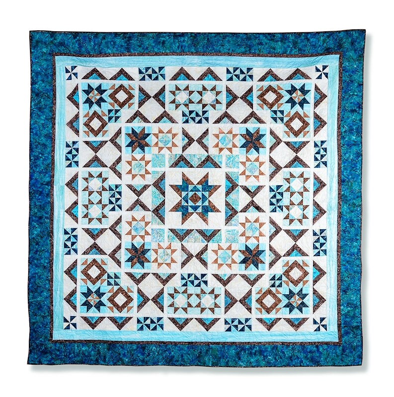 Escape to a beach camping getaway on the beautiful Spanish island of Ibiza with this terrific quilt made in four or seven simple steps. The setting looks complicated, but the unique blocks do all the work to create the center and concentric rows of stars and beach dunes. Featured Fabric: Tonga Ibiza by Daniela Stout for Timeless Treasures Length of time: 4 steps for the Throw or 7 for the Queen Finished Size: Throw (72" x 72") or Queen (98" x 98") Recommended add-on: Strip Tube Junior or Strip Tube Ruler (both by Cozy Quilt Designs). More Details: We feature the Strip Tube Ruler or Strip Tube Junior tube technique to complete the half-square triangles that make most of the blocks. While we give instructions to use a standard square-up ruler, our Strip Tube Rulers make things much easier and can be used on many additional projects by Cozy Quilt Designs.