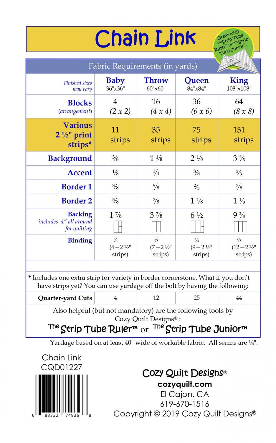 Made to feature 2-1/2in strips, Chain Link is perfect for any jelly roll, bali pop, strip treat and or scraps! With background and just a touch of accent, this terrific pattern features beautiful stars in a radiating pattern. The instructions are written in full-color and include options for four different sizes. (Baby, Throw, Queen, and King.) Once again, we use the tube techniques so the pattern can use both the Strip Tube Ruler and Strip Tube Junior!