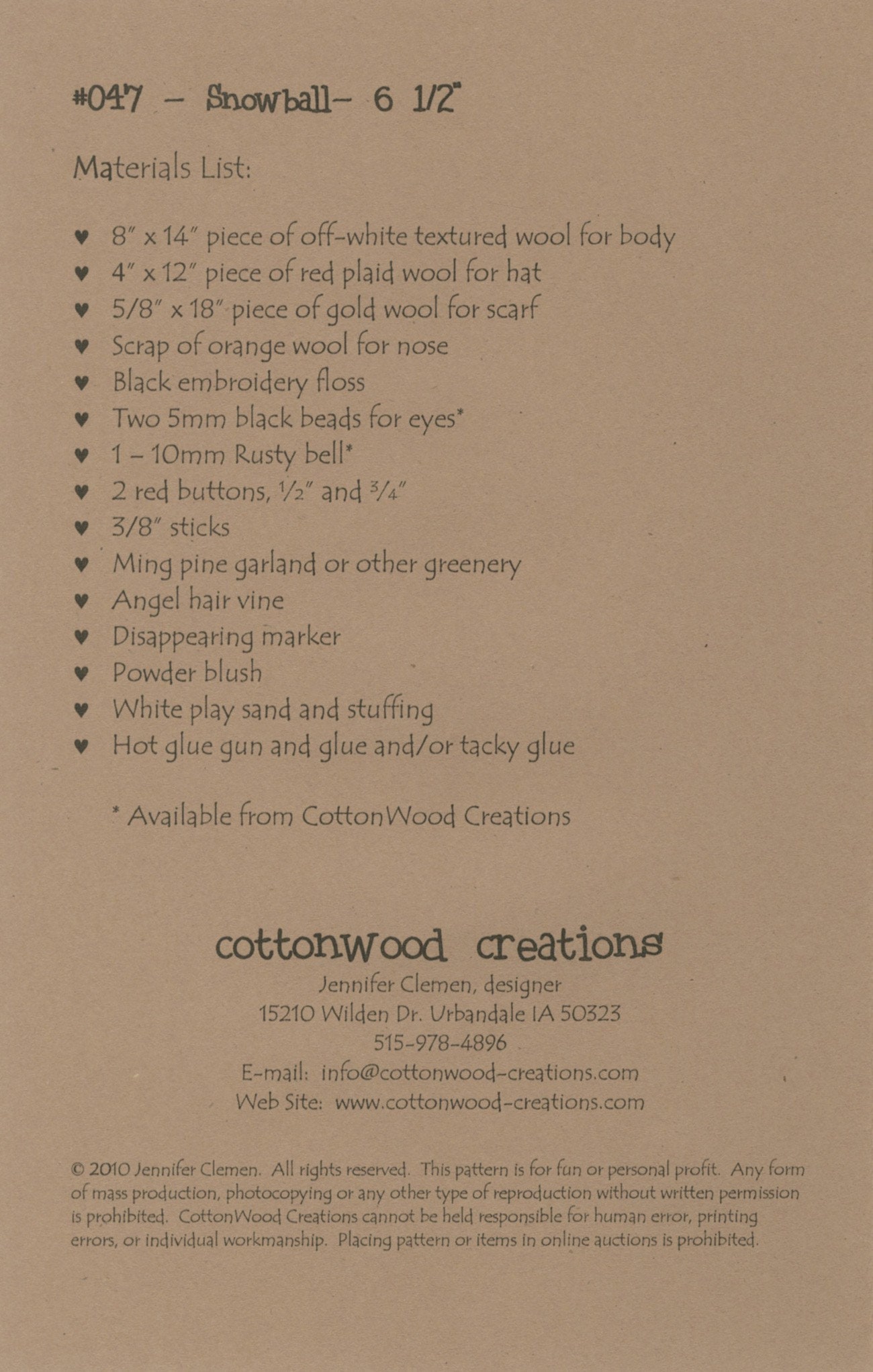 Snowball is a snowman that is 6 1/2" tall and made of wool. Accessories are available.