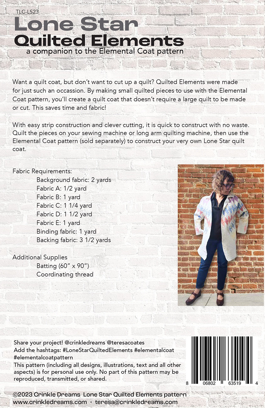 The Lone Star Quilted Elements gives quilters the chance to create small quilted sections that can be used with the Elemental Coat pattern to create a Lone Star quilt coat without making a full quilt, saving time and reducing waste.