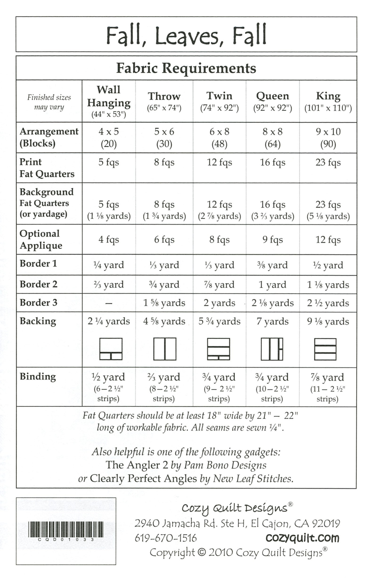 Fat quarters embrace autumn in this wonderful fall leaf pattern. You can choose to use fat quarters for just the leaves or for the leaves and the background. There is even an option for a pieced background with beautiful appliqué leaves.