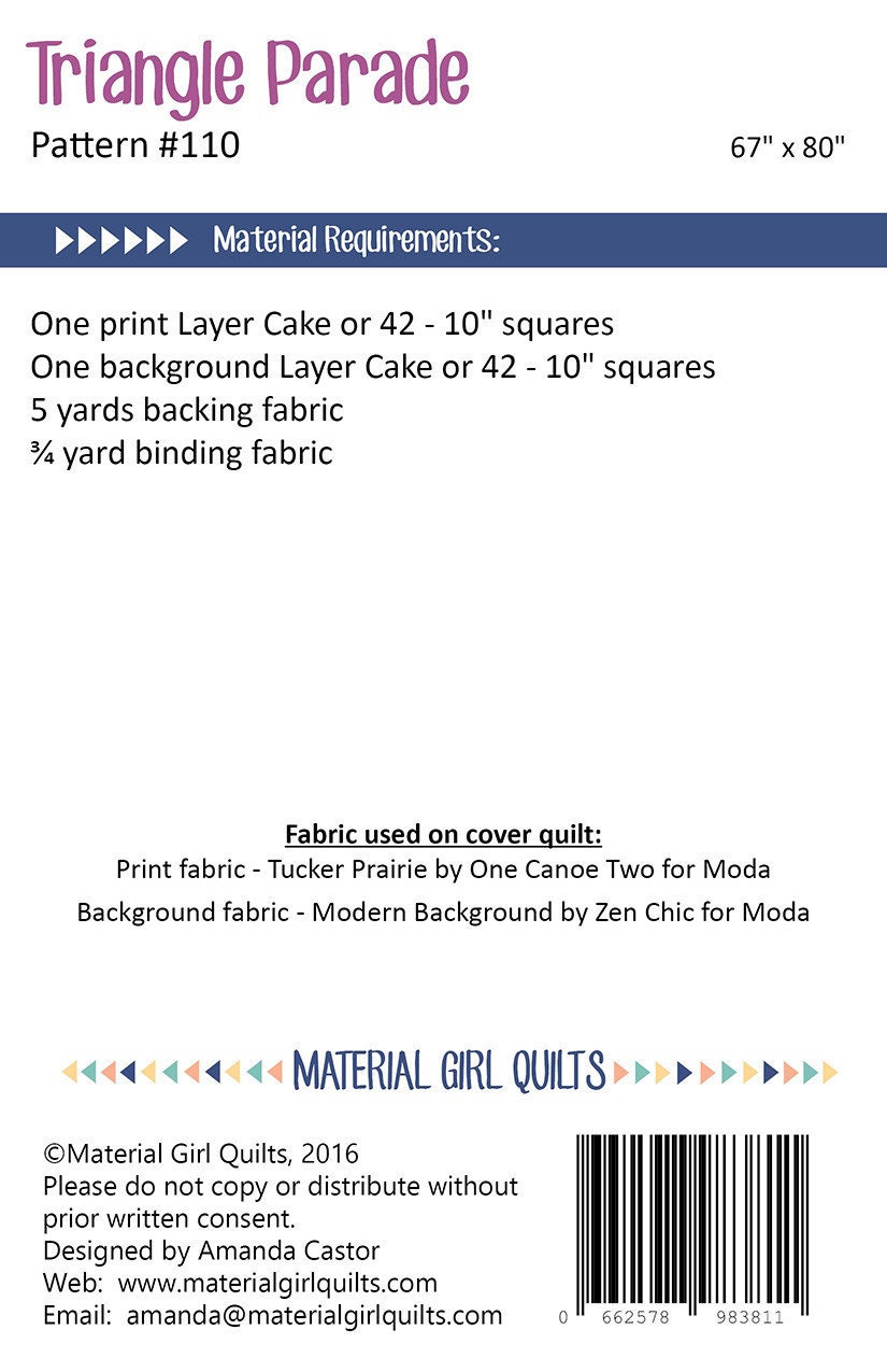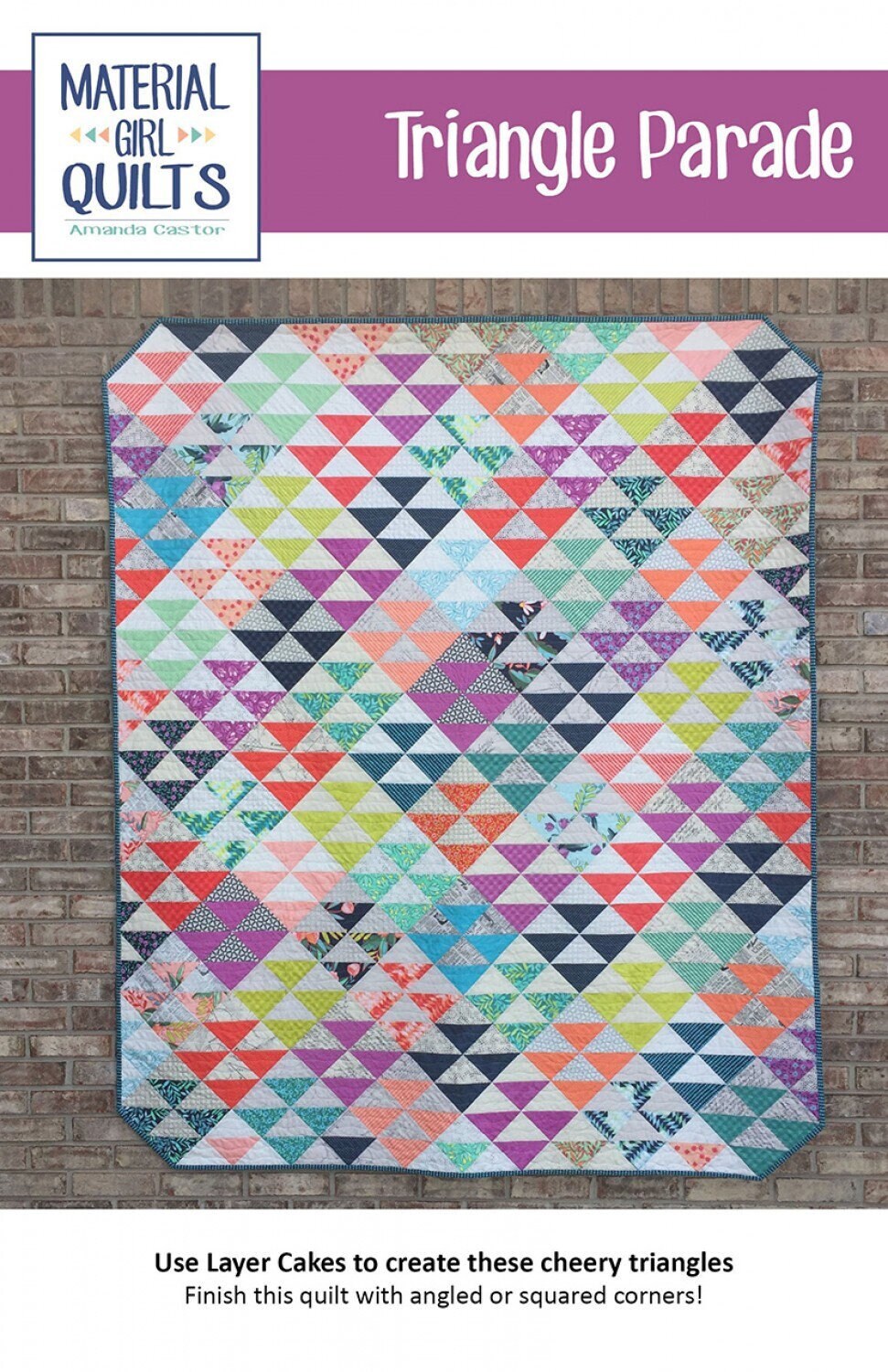 The Triangle Parade Quilt by Amanda Castor of Material Girl Quilts uses a 10-inch stacker (Layer Cake) to create a beautifully scrappy look without having to pull from your scraps! Finished size is 67" x 80".
