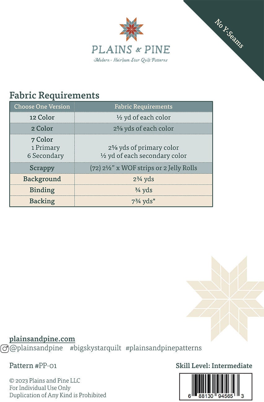 Original quilt pattern by Lindlee Smith of Plains and Pine. This design is a variation of the classic Lone Star Quilt. Finished Quilt size: 85" x 85". This is an Intermediate quilt pattern. It requires cutting and sewing on a bias, sewing with a consistent 1/4" seam, and precision to match diamond points. The pattern includes tips on how to do this accurately. The pattern includes 4 color version options with fabric requirements, instructions, and examples for each version. There is also a coloring page to plan your version. Unlike most Lone Star Quilts, there are no Y seams in this quilt pattern. This is a 5.5" x 8.5" professionally printed booklet on high quality matte paper. Each pattern is enclosed in a clear plastic bag. Fabric requirements are listed on the back of the pattern for ease of reference.