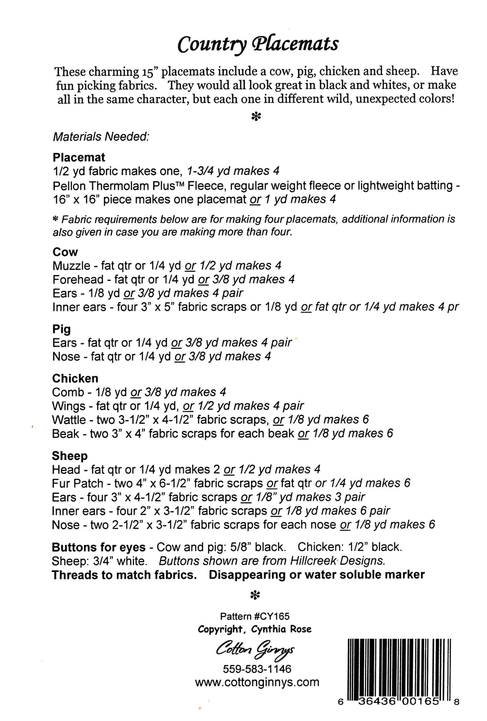Country Placemats - These charming 15” placemats include a cow, pig, chicken and sheep. Make one of each or all in the same character. Have fun picking out fabrics, maybe make them in black and white gingham for instance with color only certain features like noses. Or in wild, unexpected colors! They are very easy to make useful and unique gifts.