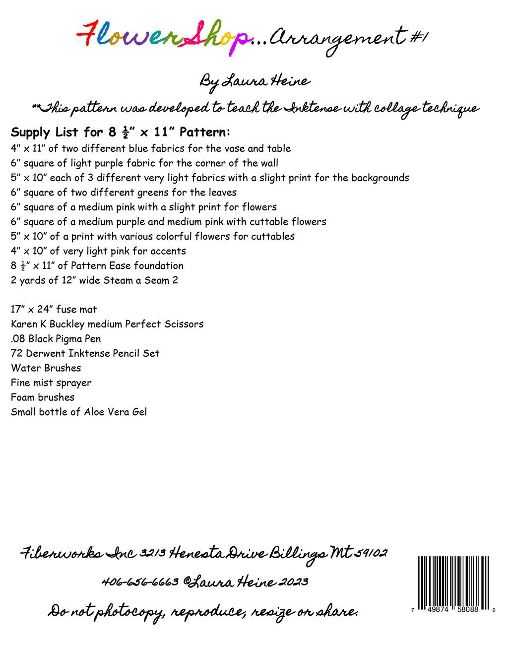 Flower Shop Arrangement #1 Collage Pattern by Laura Heine. This pattern is collage mixed with Derwent Inktense pencils. Bring this collage to life with accentuating the flowers with blending and shading of the Inktense pencils. This pattern includes full size color step by step instructions. Finished size 8 1/2x11.
