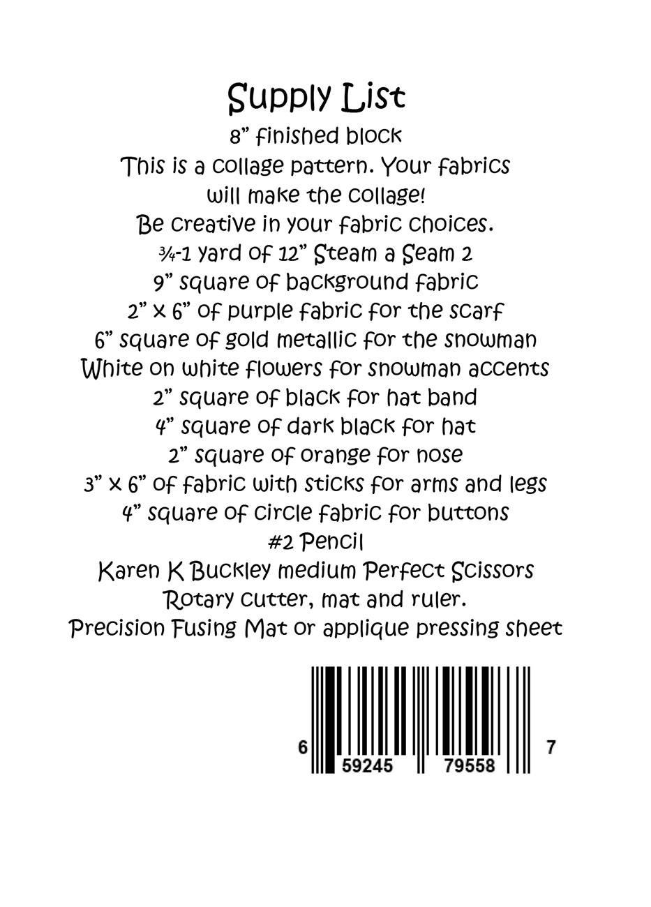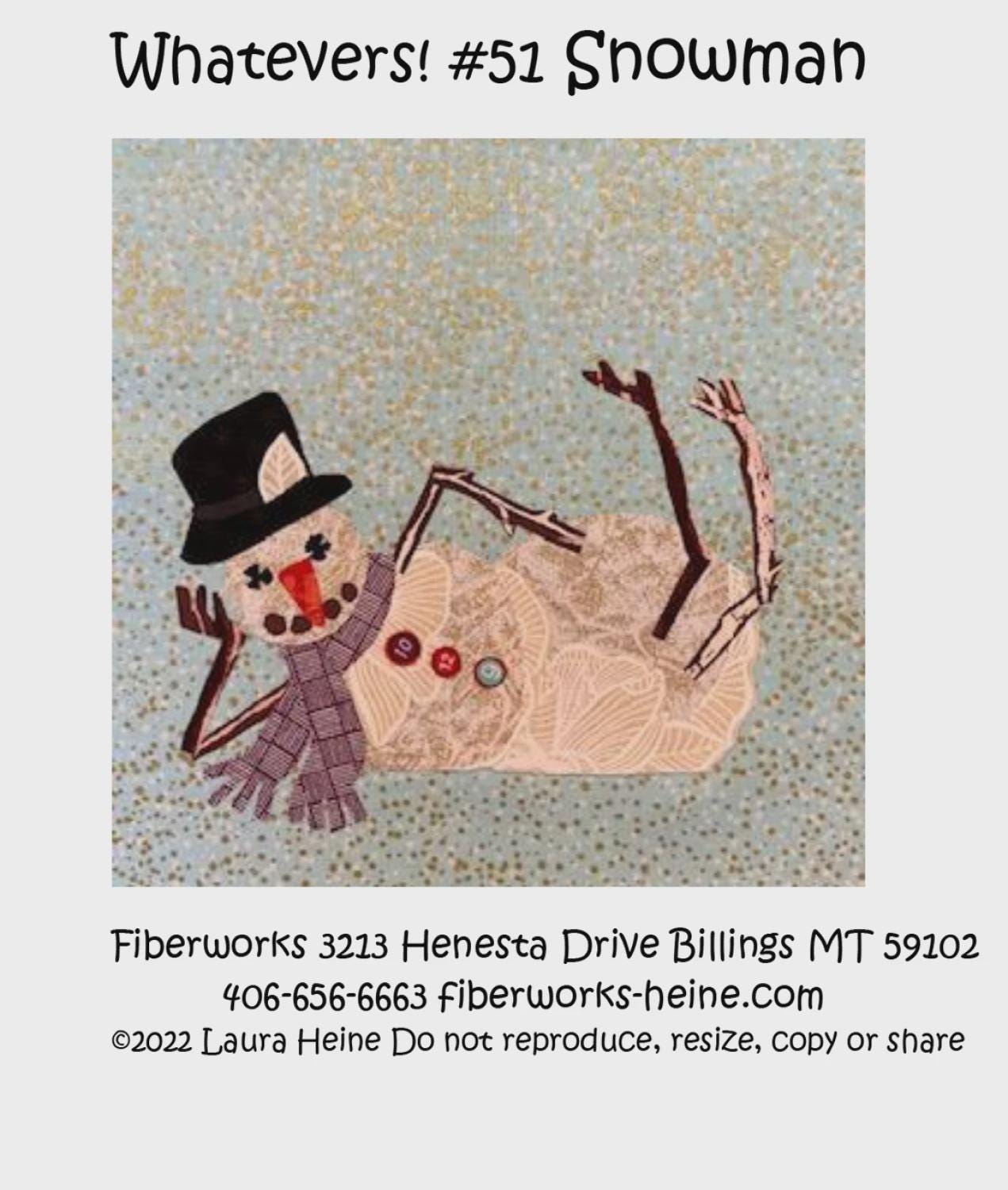 Whatevers! #51 Snowman Collage Pattern by Laura Heine. Whatevers are 8” collage blocks that you can turn into runners, potholders, tiny quilts or continue making the designs for a large collage quilt! Includes pattern with complete color photo and instructions to complete the block. You can do whatever you want with the finished block! New pattern designs will be released whenever!