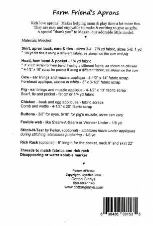 Kids love aprons! Makes helping mom or play time a lot more fun. They are easy and enjoyable to make and exciting to give as gifts. Pattern includes the cow, pig and chicken in sizes 3 thru 8.