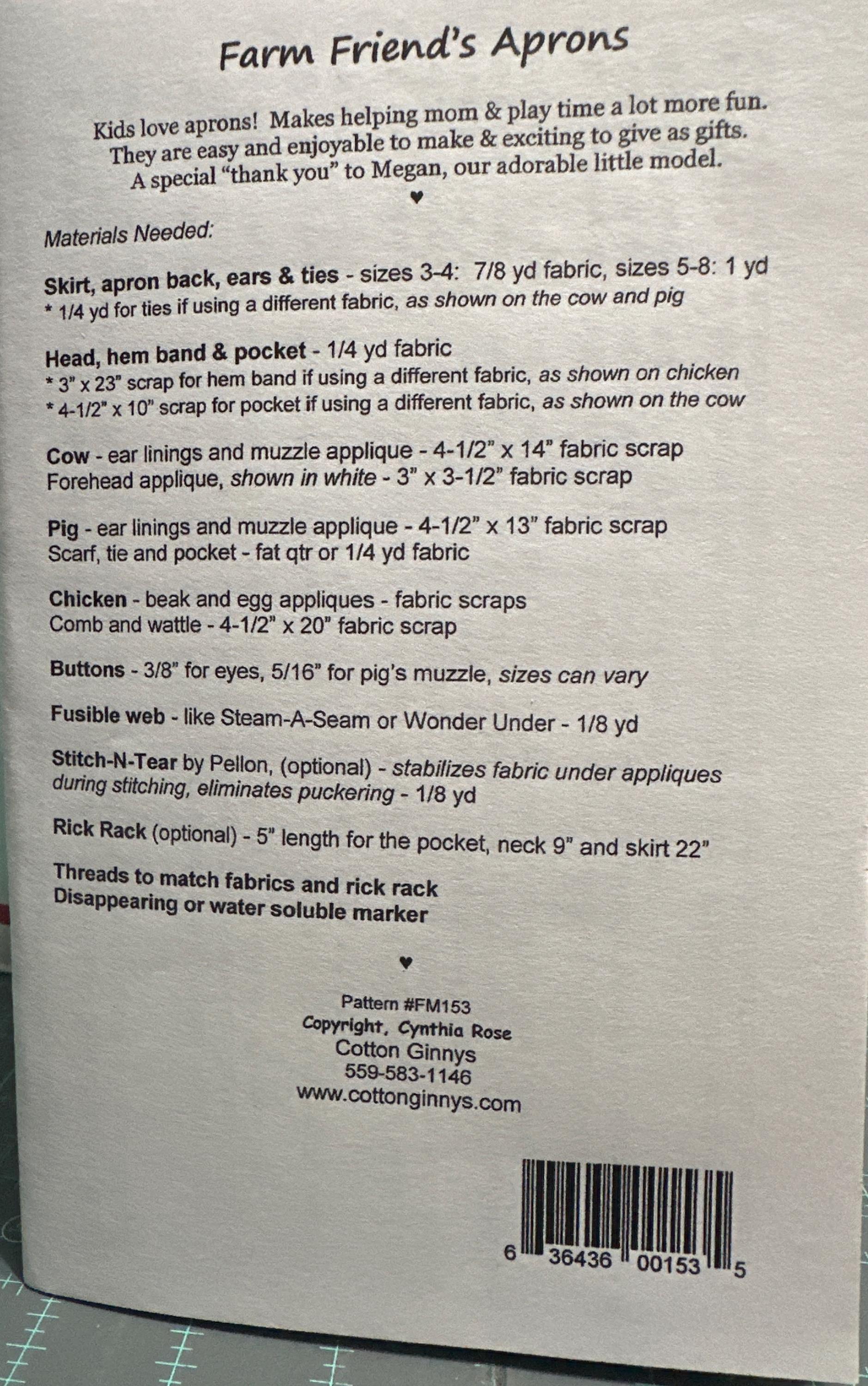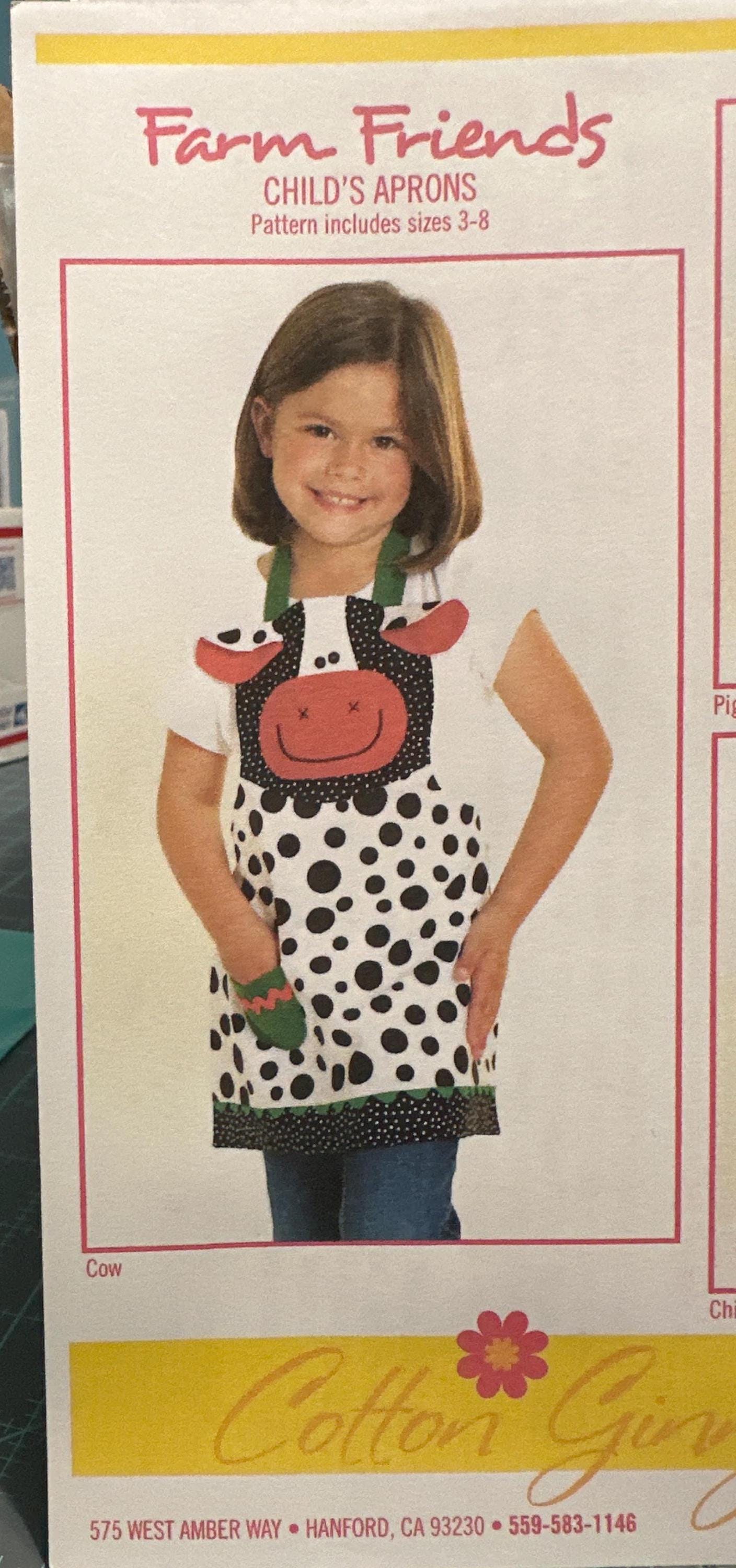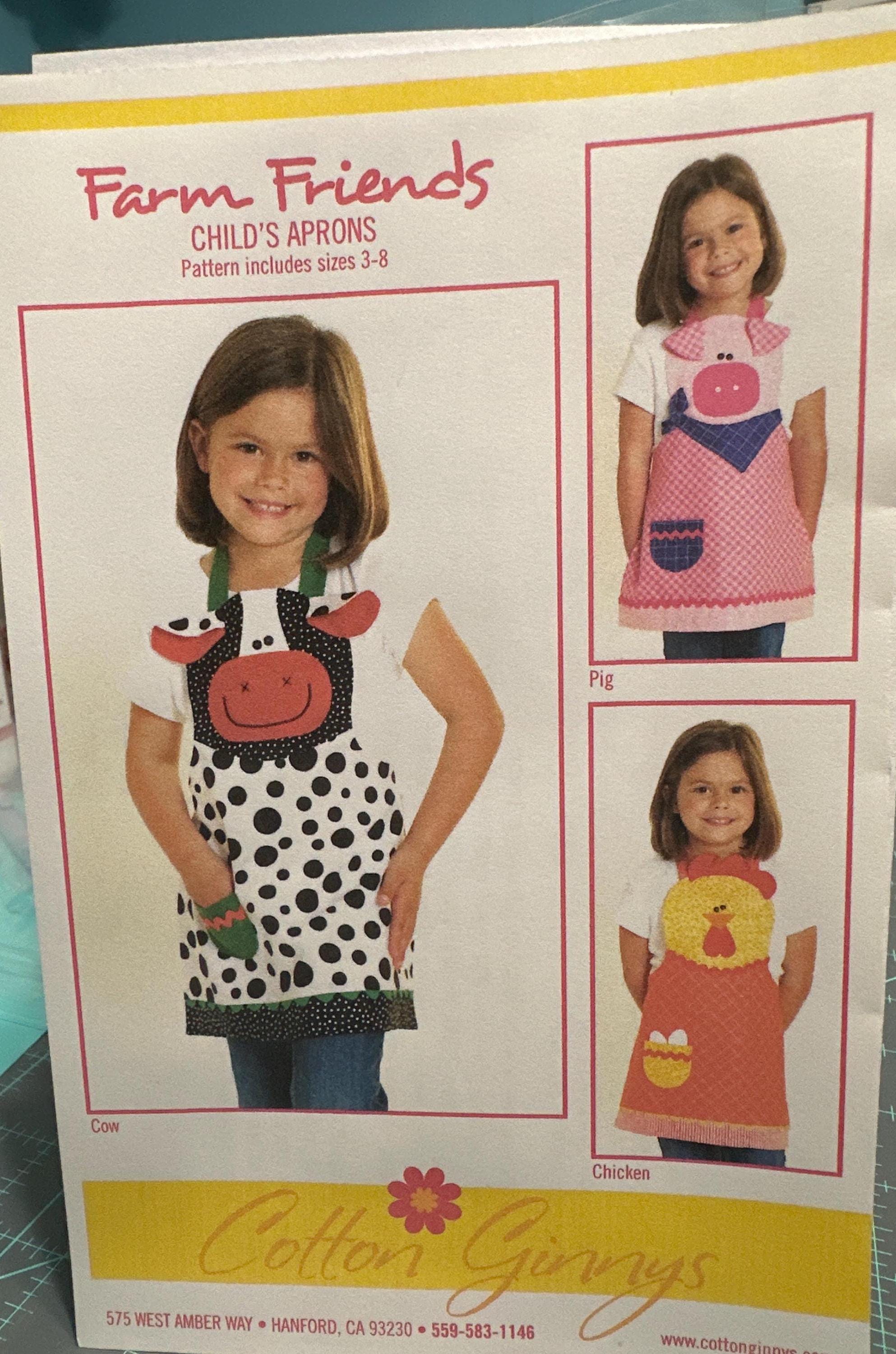 Kids love aprons! Makes helping mom or play time a lot more fun. They are easy and enjoyable to make and exciting to give as gifts. Pattern includes the cow, pig and chicken in sizes 3 thru 8.