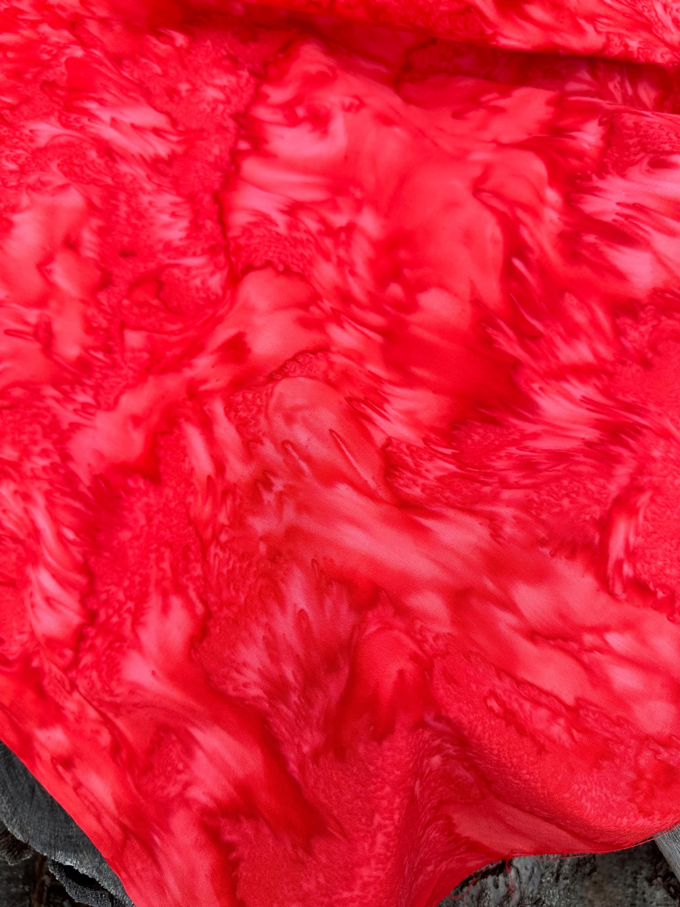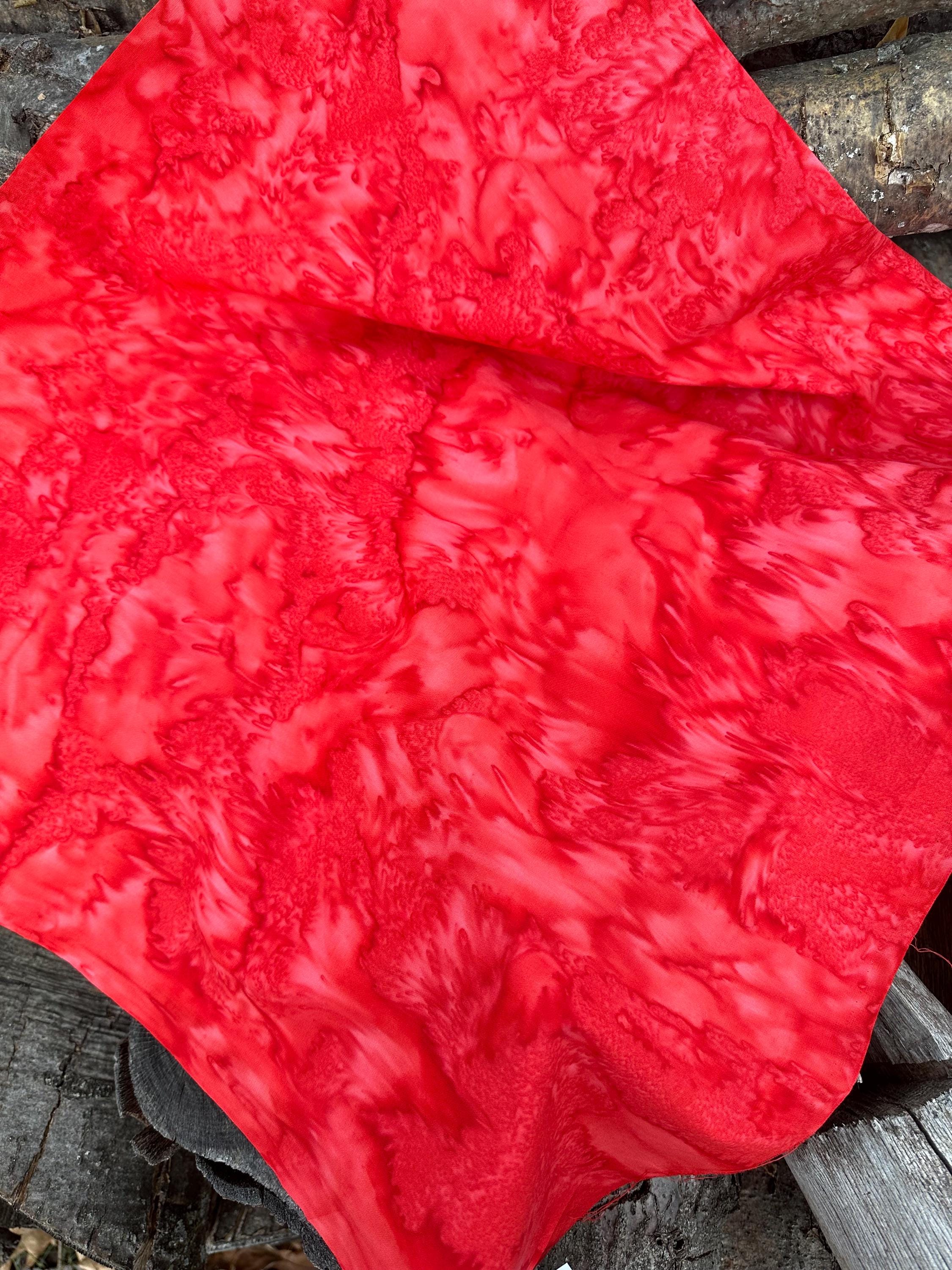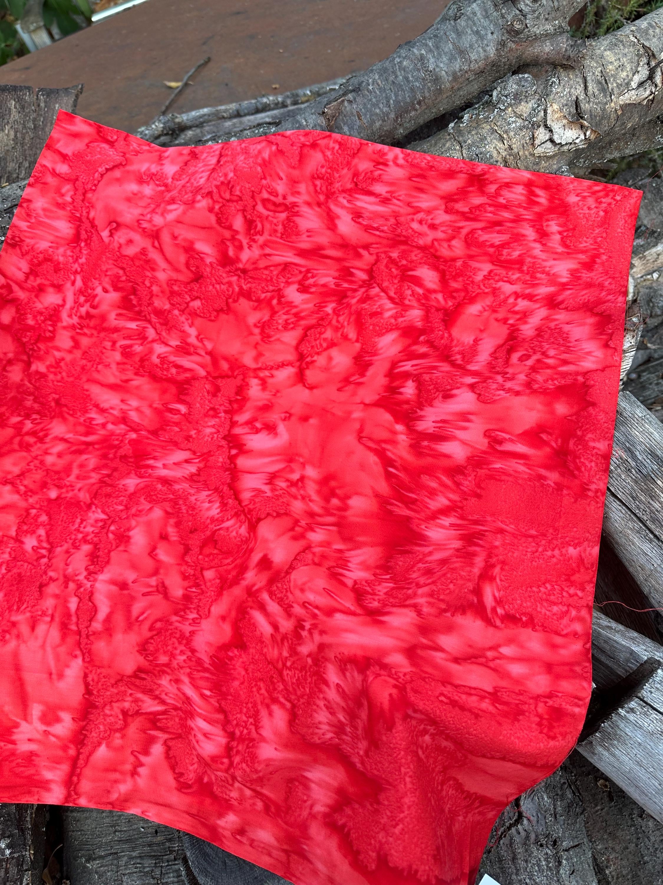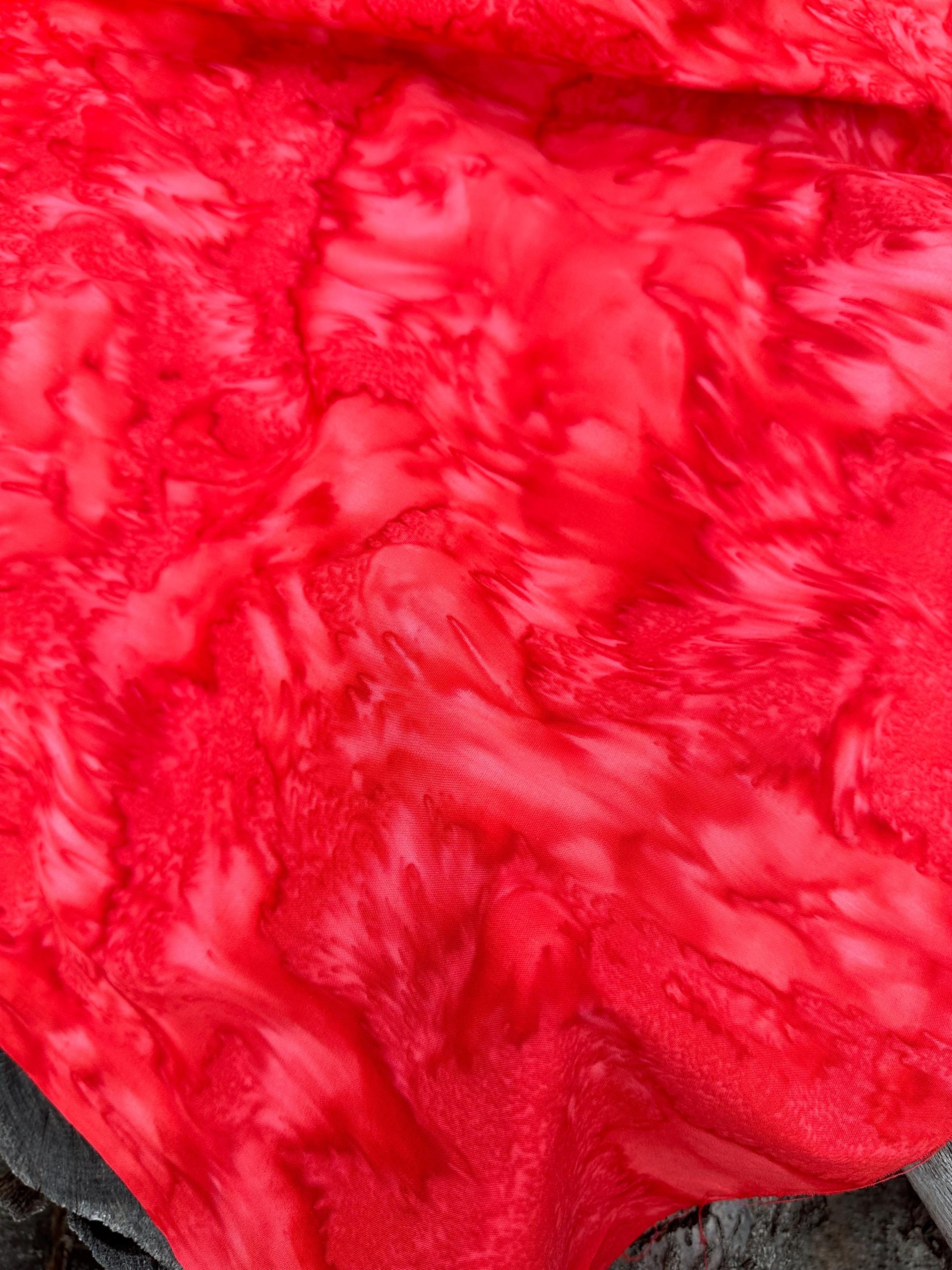 Flame Red, Bright Red 100% Cotton. 44/45” wide. Mottled style. Hand-dyed in Bali.