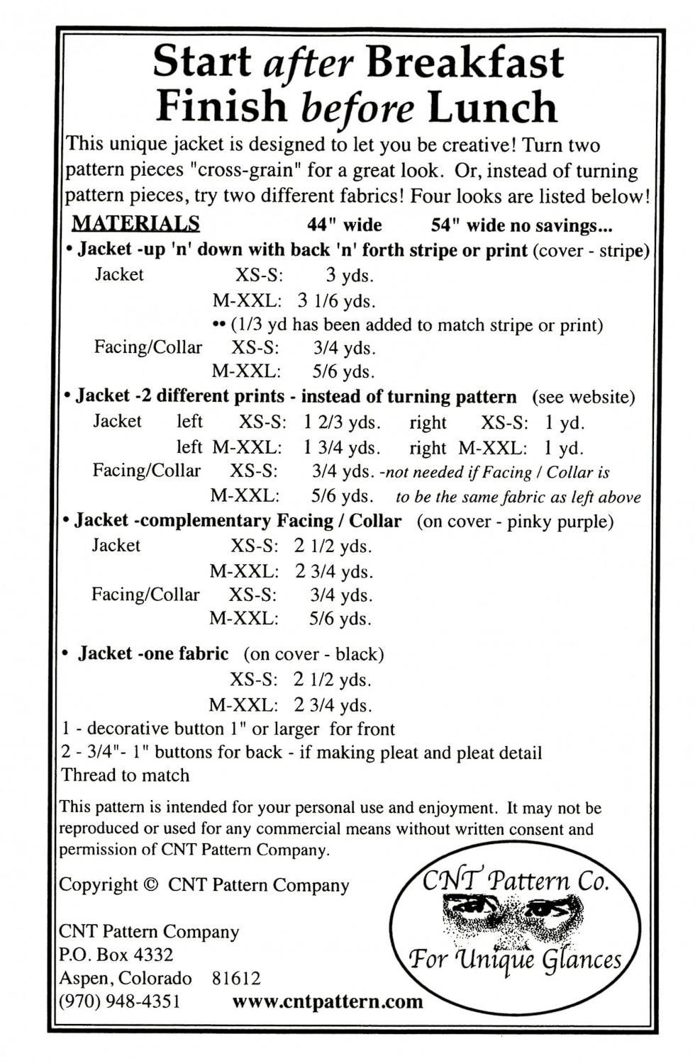 Dress up any outfit with this versatile jacket – created to fascinate! Mix up ‘n’ down with back ‘n’ forth stripe, use 2 complementary fabrics or make all from one fabric. Slimming inverted back pleat. Pockets in side seam. Easy construction = quick assembly. Let your mind create!